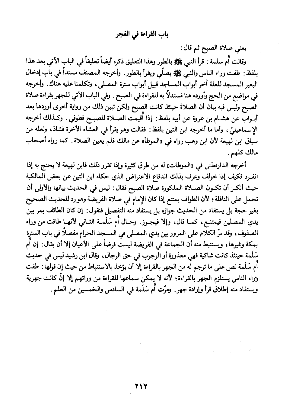 أخرجه الدارقطني في "الموطات" له من طرق كثيرة وإذا تقرر ذلك فابن لهيعة لا يحتج به إذا انفرد فكيف إذا خولف وعرف بذلك اندفاع الاعتراض الذي حكاه ابن التين عن بعض المالكية حيث أنكر أن تكون الصلاة المذكورة صلاة الصبح فقال: ليس في الحديث بيانها والأولى أن تحمل على النافلة؛ لأن الطواف يمتنع إذا كان الإِمام في صلاة الفريضة وهو رد للحديث الصحيح بغير حجة بل يستفاد من الحديث جوازه بل يستفاد منه التفصيل فنقول: إن كان الطائف يمر بين يدي المصلين فيمتنع، كما قال، وإلا فيجوز. وحال أُم سَلَمة الثاني لأنها طافت من وراء الصفوف، وقد مرّ الكلام على المرور بين يدي المصلى في المسجد الحرام مفصلًا في باب السترة بمكة وغيرها، ويستنبط منه أن الجماعة في الفريضة ليست فرضًا على الأعيان إلا أن يقال: إن أُم سَلَمة حينئذ كانت شاكية فهي معذورة أو الوجوب في حق الرجال، وقال ابن رشيد ليس في حديث أُم سَلَمة نص على ما ترجم له من الجهر بالقراءة إلا أن يؤخذ بالاستنباط من حيث إن قولها: طفت وراء الناس يستلزم الجهر بالقراءة؛ لأنه لا يمكن سماعها للقراءة من ورائهم إلا إنْ كانت جهرية ويستفاد منه إطلاق قرأ وإرادة جهر. ومرّت أُم سَلَمة في السادس والخمسين من العلم.