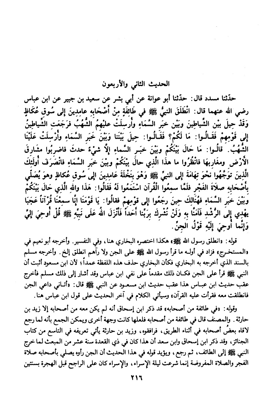 حَدَّثَنَا مُسَدَّدٌ قَالَ: حَدَّثَنَا أَبُو عَوَانَةَ عَنْ أَبِي بِشْرٍ عَنْ سَعِيدِ بْنِ جُبَيْرٍ عَنِ ابْنِ عَبَّاسٍ رضى الله عنهما قَالَ: انْطَلَقَ النَّبِيُّ -صلى الله عليه وسلم- فِي طَائِفَةٍ مِنْ أَصْحَابِهِ عَامِدِينَ إِلَى سُوقِ عُكَاظٍ، وَقَدْ حِيلَ بَيْنَ الشَّيَاطِينِ وَبَيْنَ خَبَرِ السَّمَاءِ، وَأُرْسِلَتْ عَلَيْهِمُ الشُّهُبُ، فَرَجَعَتِ الشَّيَاطِينُ إِلَى قَوْمِهِمْ. فَقَالُوا: مَا لَكُمْ؟ فَقَالُوا: حِيلَ بَيْنَنَا وَبَيْنَ خَبَرِ السَّمَاءِ، وَأُرْسِلَتْ عَلَيْنَا الشُّهُبُ. قَالُوا: مَا حَالَ بَيْنَكُمْ وَبَيْنَ خَبَرِ السَّمَاءِ إِلاَّ شَيْءٌ حَدَثَ، فَاضْرِبُوا مَشَارِقَ الأَرْضِ وَمَغَارِبَهَا، فَانْظُرُوا مَا هَذَا الَّذِي حَالَ بَيْنَكُمْ وَبَيْنَ خَبَرِ السَّمَاءِ فَانْصَرَفَ أُولَئِكَ الَّذِينَ تَوَجَّهُوا نَحْوَ تِهَامَةَ إِلَى النَّبِيِّ -صلى الله عليه وسلم- وَهْوَ بِنَخْلَةَ، عَامِدِينَ إِلَى سُوقِ عُكَاظٍ وَهْوَ يُصَلِّي بِأَصْحَابِهِ صَلاَةَ الْفَجْرِ، فَلَمَّا سَمِعُوا الْقُرْآنَ اسْتَمَعُوا لَهُ فَقَالُوا: هَذَا وَاللَّهِ الَّذِي حَالَ بَيْنَكُمْ وَبَيْنَ خَبَرِ السَّمَاءِ. فَهُنَالِكَ حِينَ رَجَعُوا إِلَى قَوْمِهِمْ فَقَالُوا: يَا قَوْمَنَا إِنَّا سَمِعْنَا قُرْآنًا عَجَبًا يَهْدِي إِلَى الرُّشْدِ فَآمَنَّا بِهِ وَلَنْ نُشْرِكَ بِرَبِّنَا أَحَدًا فَأَنْزَلَ اللَّهُ عَلَى نَبِيِّهِ -صلى الله عليه وسلم- قُلْ أُوحِيَ إِلَيَّ وَإِنَّمَا أُوحِيَ إِلَيْهِ قَوْلُ الْجِنِّ.