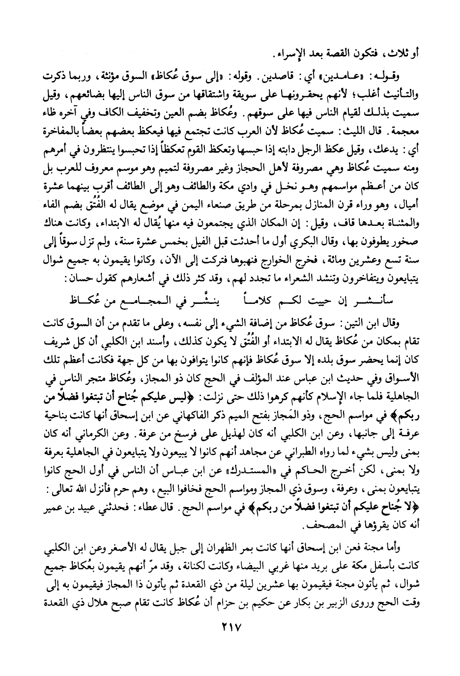 وقال ابن التين: سوق عُكاظ من إضافة الشيء إلى نفسه، وعلى ما تقدم من أن السوق كانت تقام بمكان من عُكاظ يقال له الابتداء أو الفُتُق لا يكون كذلك، وأسند ابن الكلبي أن كل شريف كان إنما يحضر سوق بلده إلا سوق عُكاظ فإنهم كانوا يتوافون بها من كل جهة فكانت أعظم تلك الأسواق وفي حديث ابن عباس عند المؤلف في الحج كان ذو المجاز، وعُكاظ متجر الناس في الجاهلية فلما جاء الإِسلام كأنهم كرهوا ذلك حتى نزلت: {لَيْسَ عَلَيْكُمْ جُنَاحٌ أَنْ تَبْتَغُوا فَضْلًا مِنْ رَبِّكُمْ} في مواسم الحج، وذو المَجاز بفتح الميم ذكر الفاكهاني عن ابن إسحاق أنها كانت بناحية عرفة إلى جانبها، وعن ابن الكلبي أنه كان لهذيل على فرسخ من عرفة. وعن الكرماني أنه كان بمنى وليس بشيء لما رواه الطبراني عن مجاهد أنهم كانوا لا يبيعون ولا يتبايعون في الجاهلية بعرفة ولا بمنى، لكن أخرج الحاكم في "المستدرك" عن ابن عباس أن الناس في أول الحج كانوا يتبايعون بمنى، وعرفة، وسوق ذي المجاز ومواسم الحج فخافوا البيع، وهم حرم فأنزل الله تعالى: {لَيْسَ عَلَيْكُمْ جُنَاحٌ أَنْ تَبْتَغُوا فَضْلًا مِنْ رَبِّكُمْ} في مواسم الحج. قال عطاء: فحدثني عبيد بن عمير أنه كان يقرؤها في المصحف.