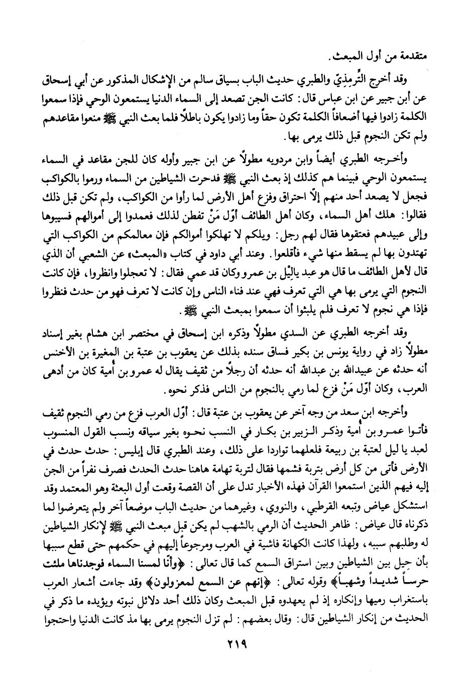 وأخرجه الطبري أيضًا وابن مردويه مطولًا عن ابن جبير وأوله كان للجن مقاعد في السماء يستمعون الوحي فبينما هم كذلك إذ بعث النبي -صلى الله عليه وسلم- فدحرت الشياطين من السماء ورموا بالكواكب فجعل لا يصعد أحد منهم إلاَّ احتراق وفزع أهل الأرض لما رأوا من الكواكب، ولم تكن قبل ذلك فقالوا: هلك أهل السماء، وكان أهل الطائف أوّل مَنْ تفطن لذلك فعمدوا إلى أموالهم فسيبوها وإلى عبيدهم فعتقوها فقال لهم رجل: ويلكم لا تهلكوا أموالكم فإن معالمكم من الكواكب التي تهتدون بها لم يسقط منها شيء فأقلعوا. وعند أبي داود في كتاب "المبعث" عن الشعبي أن الذي قال لأهل الطائف ما قال هو عبد يالِيْل بن عمرو وكان قد عمي فقال: لا تعجلوا وانظروا، فإن كانت النجوم التي يرمى بها هي التي تعرف فهي عند فناء الناس وإن كانت لا تعرف فهو من حدث فنظروا فإذا هي نجوم لا تعرف فلم يلبثوا أن سمعوا بمبعث النبي -صلى الله عليه وسلم-.