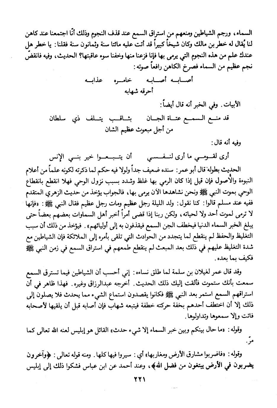 الحديث بطوله قال أبو عمر: سنده ضعيف جدًا ولولا فيه حكم لما ذكرته لكونه علمًا من أعلام النبوءة والأصول فإن قيل إذا كان الرمي بها غلظ وشدد بسبب نزول الوحي فهلا انقطع بانقطاع الوحي بموت النبي -صلى الله عليه وسلم- ونحن نشاهدها الآن يرمى بها، فالجواب يؤخذ من حديث الزهري المتقدم ففيه عند مسلم قالوا: كنا نقول: ولد الليلة رجل عظيم ومات رجل عظيم فقال النبي -صلى الله عليه وسلم-: "فإنها لا ترمى لموت أحد ولا لحياته، ولكن ربنا إذا قضى أمرًا أخبر أهل السماوات بعضهم بعضًا حتى يبلغ الخبر السماء الدنيا فيخطف الجن السمع فيقذفون به إلى أوليائهم". فيؤخذ من ذلك أن سبب التغليظ والحفظ لم ينقطع لما يتجدد من الحوادث التي تلقى بأمره إلى الملائكة فإن الشياطين مع شدة التغليظ عليهم في ذلك بعد المبعث لم ينقطع طمعهم في استراق السمع في زمن النبي -صلى الله عليه وسلم- فكيف بما بعده.