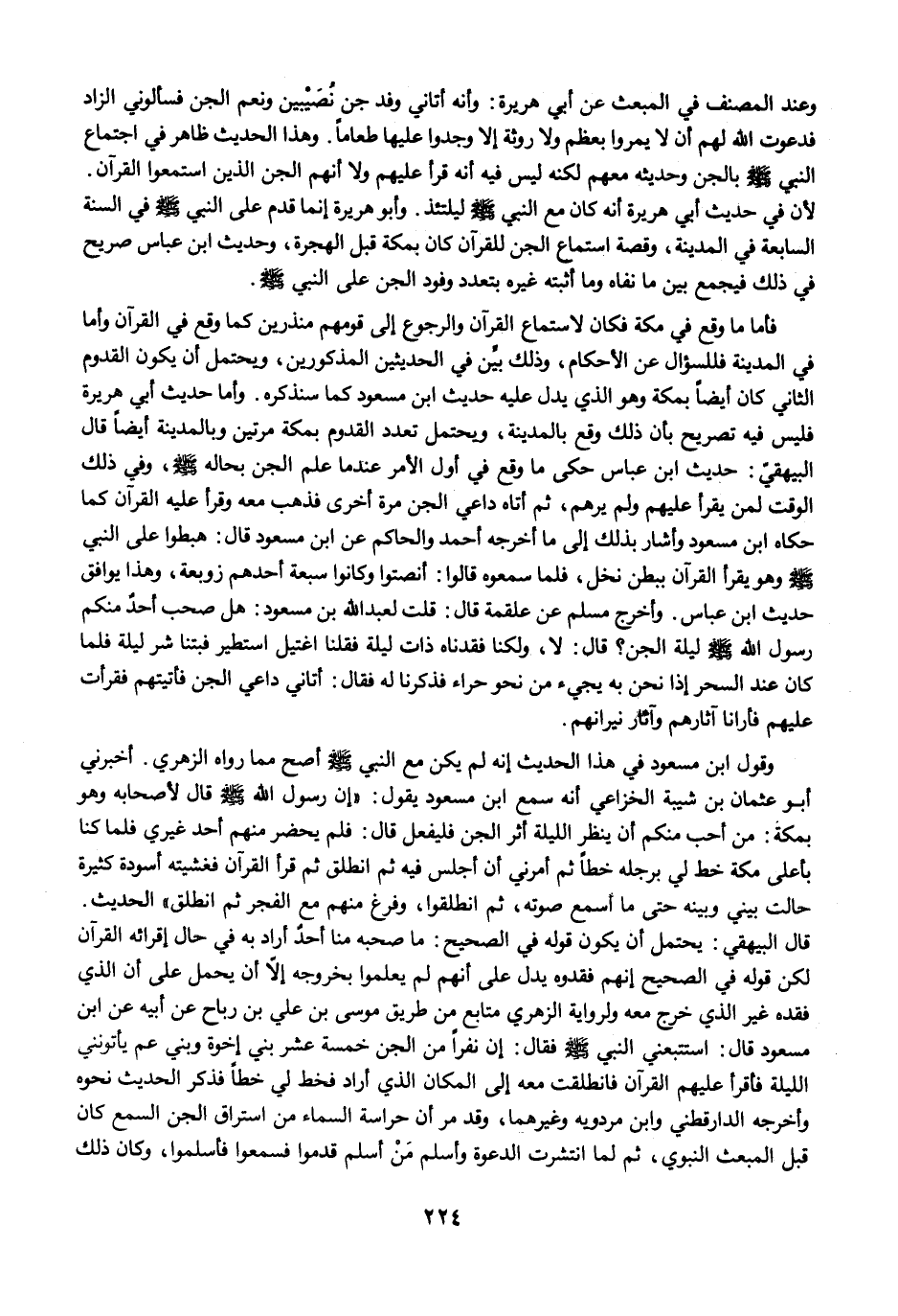 وقول ابن مسعود في هذا الحديث إنه لم يكن مع النبي -صلى الله عليه وسلم- أصح مما رواه الزهري. أخبرني أبو عثمان بن شيبة الخزاعي أنه سمع ابن مسعود يقول: "إن رسول الله -صلى الله عليه وسلم- قال لأصحابه وهو بمكة: من أحب منكم أن ينظر الليلة أثر الجن فليفعل قال: فلم يحضر منهم أحد غيري فلما كنا بأعلى مكة خط لي برجله خطًا ثم أمرني أن أجلس فيه ثم انطلق ثم قرأ القرآن فغشيته أسودة كثيرة حالت بيني وبينه حتى ما أسمع صوته، ثم انطلقوا، وفرغ منهم مع الفجر ثم انطلق" الحديث. قال البيهقي: يحتمل أن يكون قوله في الصحيح: ما صحبه منا أحدٌ أراد به في حال إقرائه القرآن لكن قوله في الصحيح إنهم فقدوه يدل على أنهم لم يعلموا بخروجه إلاَّ أن يحمل على أن الذي فقده غير الذي خرج معه ولرواية الزهري متابع من طريق موسى بن علي بن رباح عن أبيه عن ابن مسعود قال: استتبعني النبي -صلى الله عليه وسلم- فقال: إن نفرًا من الجن خمسة عشر بني إخوة وبني عم يأتونني الليلة فاقرأ عليهم القرآن فانطلقت معه إلى المكان الذي أراد فخط لي خطًا فذكر الحديث نحوه وأخرجه الدارقطني وابن مردويه وغيرهما، وقد مرَّ أن حراسة السماء من استراق الجن السمع كان قبل المبعث النبوي، ثم لما انتشرت الدعوة وأسلم مَنْ أسلم قدموا فسمعوا فأسلموا، وكان ذلك