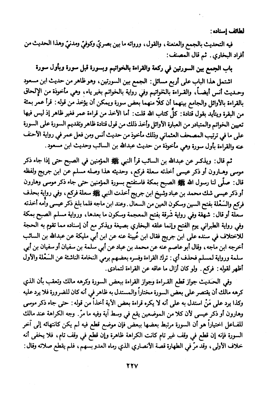 اشتمل هذا الباب على أربع مسائل: الجمع بين السورتين، وهو ظاهر من حديث ابن مسعود وحديث أنس أيضًا، والقراءة بالخواتيم وفي رواية بالخواتم بغير ياء، وهي مأخوذة من الإلحاق بالقراءة بالأوائل والجامع بينهما أن كلاً منهما بعض سورة ويمكن أن يؤخذ من قوله: قرأ عمر بمئة من البقرة ويتأيد بقول قتادة: كلٌّ كتاب الله قلت: أما الأخذ من قراءة عمر فغير ظاهر إذ ليس فيها تعيين الخواتم والمتبادر من العبارة الأوائل وأخذ ذلك من قول قتادة ظاهر وتقديم السورة على السورة على ما في ترتيب المصحف العثماني وذلك مأخوذ من حديث أنس ومن فعل عمر في رواية الأحنف عنه والقراءة بأول سورة وهي مأخوذ من حديث عبد الله بن السائب وحديث ابن مسعود.