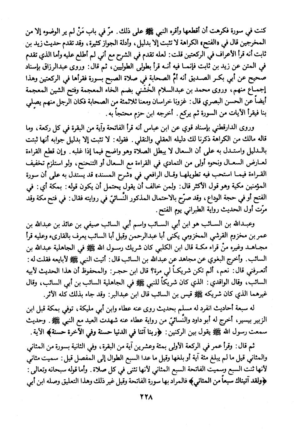 كنت في سورة فكرهت أن أقطعها وأقره النبي -صلى الله عليه وسلم- على ذلك. مرّ في باب مَنْ لم ير الوضوء إلا من المخرجين قال في "الفتح" الكراهة لا تثبت إلابدليل، وأدلة الجواز كثيرة، وقد تقدم حديث زيد بن ثابت أنه قرأ الأعراف في الركعتين قلت: لعله تقدم في الشرح مع أني لم أطلع عليه وأما الذي تقدم في المتن عن زيد بن ثابت فإنما فيه أنه قرأ بطولى الطوليين، ثم قال: وروى عبد الرزاق بإسناد صحيح عن أبي بكر الصديق أنه أمَّ الصحابة في صلاة الصبح بسورة فقرأها في الركعتين وهذا إجماع منهم، وروى محمد بن عبد السلام الخُشَني بضم الخاء المعجمة وفتح الشين المعجمة أيضًا عن الحسن البصري قال: غزونا خراسان ومعنا ثلاثمائة من الصحابة فكان الرجل منهم يصلي بنا فيقرأ الآيات من السورة ثم يركع. أخرجه ابن حزم محتجًا به.