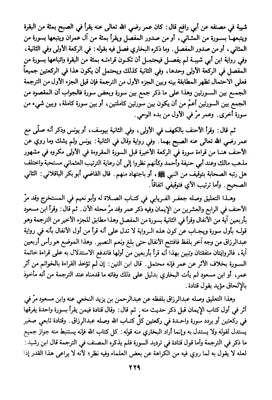 شيبة في مصنفه عن أبي رافع قال: كان عمر رضي الله تعالى عنه يقرأ في الصبح بمئة من البقرة ويتبعها بسورة من المثاني، أو من صدور المفصل ويقرأ بمئة من آل عمران ويتبعها بسورة من المثاني، أو من صدور المفصل. وما ذكره البخاري فصل فيه بقوله: في الركعة الأولى وفي الثانية، وفي رواية ابن أبي شيبة لم يفصل فيحتمل أن تكون قراءته بمئة من البقرة واتباعها بسورة من المفصل في الركعة الأولى وحدها، وفي الثانية كذلك ويحتمل أن يكون هذا في الركعتين جميعًا فعلى الاحتمال تظهر المطابقة بينه وبين الجزء الأول من الترجمة فإن قيل الجزء الأول من الترجمة الجمع بين السورتين وهذا على ما ذكر جمع بين سورة ويعض سورة فالجواب أن المقصود من الجمع بين السورتين أعمّ من أن يكون بين سورتين كاملتين، أو بين سورة كلاملة، وبين شيء من سورة أخرى. وعمر مرّ في الأول من بدء الوحي.