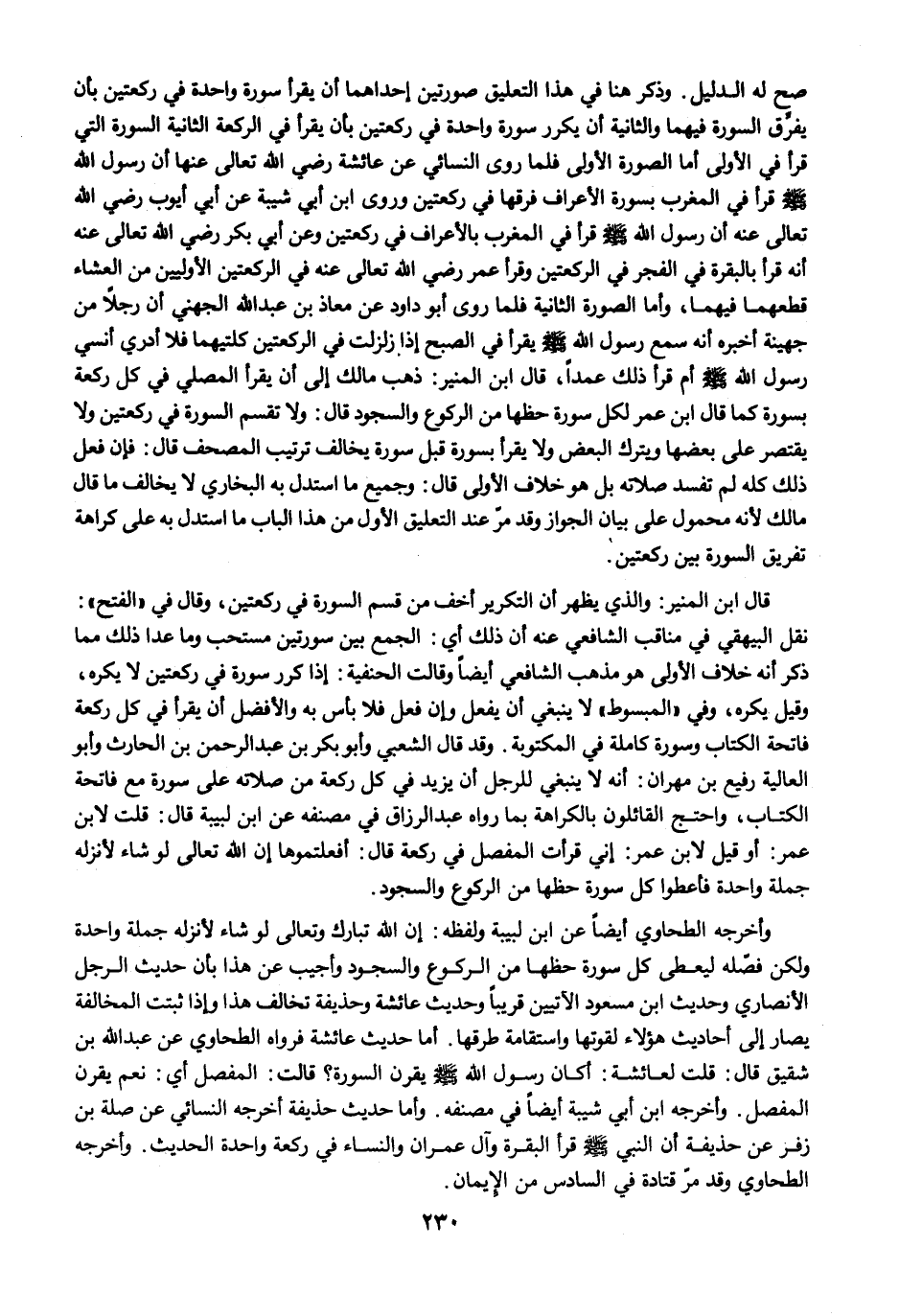 قال ابن المنير: والذي يظهر أن التكرير أخف من قسم السورة في ركعتين، وقال في "الفتح": نقل البيهقي في مناقب الشافعي عنه أن ذلك أي: الجمع بين سورتين مستحب وما عدا ذلك مما ذكر أنه خلاف الأولى هو مذهب الشافعي أيضًا وقالت الحنفية: إذا كرر سورة في ركعتين لا يكره، وقيل يكره، وفي "المبسوط" لا ينبغي أن يفعل وإن فعل فلا بأس به والأفضل أن يقرأ في كل ركعة فاتحة الكتاب وسورة كاملة في المكتوية. وقد قال الشعبي وأبو بكر بن عبد الرحمن بن الحارث وأبو العالية رفيع بن مهران: أنه لا ينبغي للرجل أن يزيد في كل ركعة من صلاته على سورة مع فاتحة الكتاب، واحتج القائلون بالكراهة بما رواه عبد الرزاق في مصنفه عن ابن لبيبة قال: قلت لابن عمر: أو قيل لابن عمر: إني قرأت المفصل في ركعة قال: أفعلتموها إن الله تعالى لو شاء لأنزله جملة واحدة فأعطوا كل سورة حظها من الركوع والسجود.
