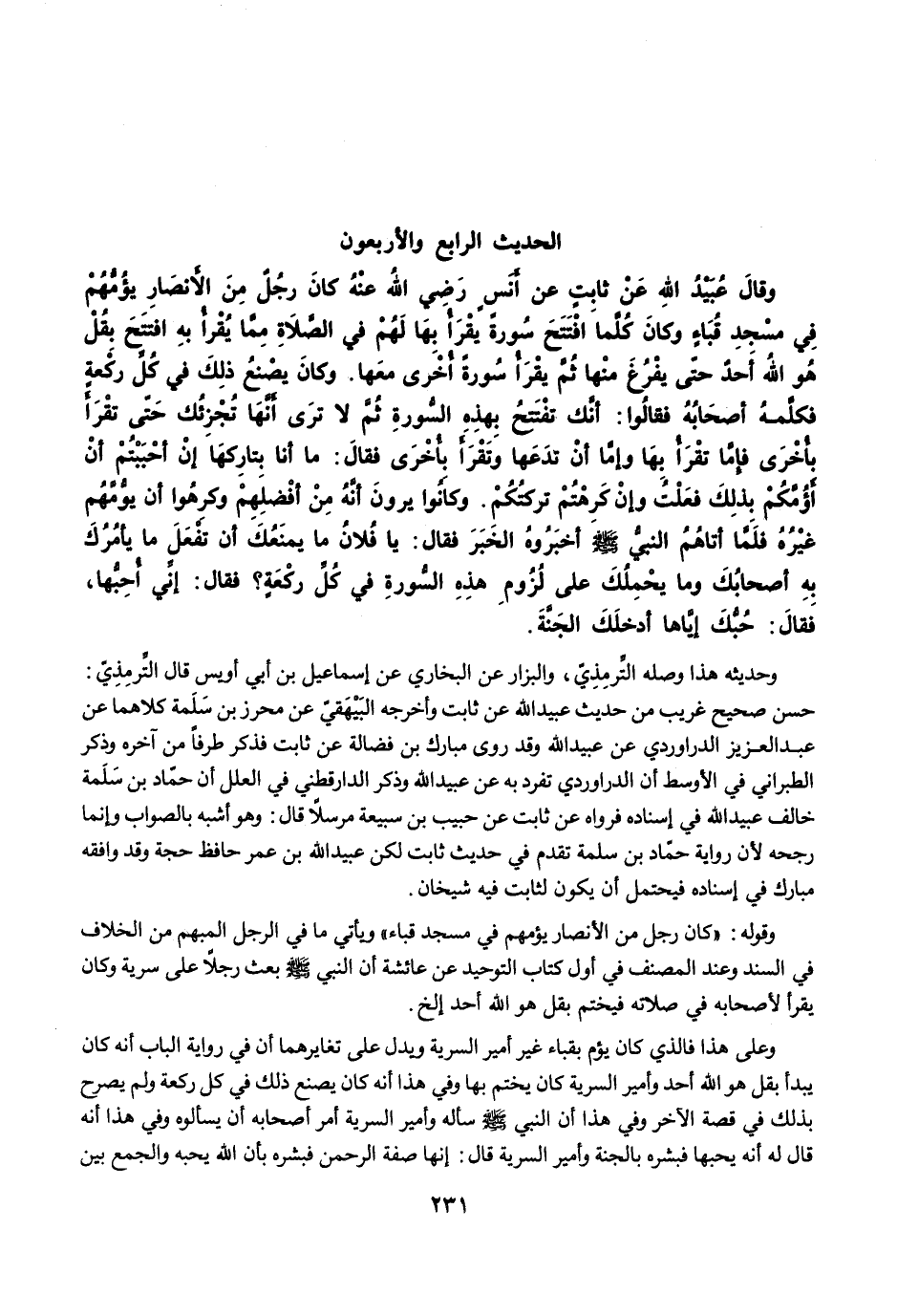 وَقَالَ عُبَيْدُ اللَّهِ عَنْ ثَابِتٍ عَنْ أَنَسٍ رضى الله عنه كَانَ رَجُلٌ مِنَ الأَنْصَارِ يَؤُمُّهُمْ فِي مَسْجِدِ قُبَاءٍ، وَكَانَ كُلَّمَا افْتَتَحَ سُورَةً يَقْرَأُ بِهَا لَهُمْ فِي الصَّلاَةِ مِمَّا يَقْرَأُ بِهِ افْتَتَحَ بِقُلْ هُوَ اللَّهُ أَحَدٌ حَتَّى يَفْرُغَ مِنْهَا، ثُمَّ يَقْرَأُ سُورَةً أُخْرَى مَعَهَا، وَكَانَ يَصْنَعُ ذَلِكَ فِي كُلِّ رَكْعَةٍ، فَكَلَّمَهُ أَصْحَابُهُ فَقَالُوا: إِنَّكَ تَفْتَتِحُ بِهَذِهِ السُّورَةِ، ثُمَّ لاَ تَرَى أَنَّهَا تُجْزِئُكَ حَتَّى تَقْرَأَ بِأُخْرَى، فَإِمَّا أَنْ تَقْرَأَ بِهَا وَإِمَّا أَنْ تَدَعَهَا وَتَقْرَأَ بِأُخْرَى. فَقَالَ: مَا أَنَا بِتَارِكِهَا، إِنْ أَحْبَبْتُمْ أَنْ أَؤُمَّكُمْ بِذَلِكَ فَعَلْتُ، وَإِنْ كَرِهْتُمْ تَرَكْتُكُمْ. وَكَانُوا يَرَوْنَ أَنَّهُ مِنْ أَفْضَلِهِمْ، وَكَرِهُوا أَنْ يَؤُمَّهُمْ غَيْرُهُ، فَلَمَّا أَتَاهُمُ النَّبِيُّ -صلى الله عليه وسلم- أَخْبَرُوهُ الْخَبَرَ فَقَالَ: يَا فُلاَنُ مَا يَمْنَعُكَ أَنْ تَفْعَلَ مَا يَأْمُرُكَ بِهِ أَصْحَابُكَ وَمَا يَحْمِلُكَ عَلَى لُزُومِ هَذِهِ السُّورَةِ فِي كُلِّ رَكْعَةٍ؟. فَقَالَ: إِنِّي أُحِبُّهَا. فَقَالَ: حُبُّكَ إِيَّاهَا أَدْخَلَكَ الْجَنَّةَ.