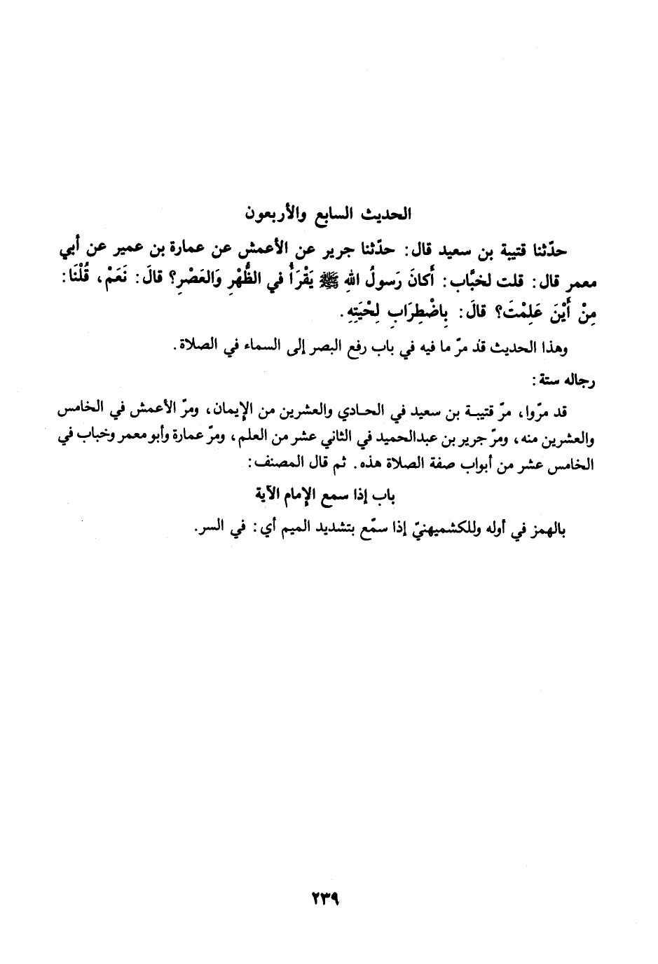 حَدَّثَنَا قُتَيْبَةُ بْنُ سَعِيدٍ قَالَ: حَدَّثَنَا جَرِيرٌ عَنِ الأَعْمَشِ عَنْ عُمَارَةَ بْنِ عُمَيْرٍ عَنْ أَبِي مَعْمَرٍ قَالَ: قُلْتُ لِخَبَّابٍ: أَكَانَ رَسُولُ اللَّهِ -صلى الله عليه وسلم- يَقْرَأُ فِي الظُّهْرِ وَالْعَصْرِ؟ قَالَ: نَعَمْ. قُلْنَا: مِنْ أَيْنَ عَلِمْتَ؟ قَالَ: بِاضْطِرَابِ لِحْيَتِهِ.