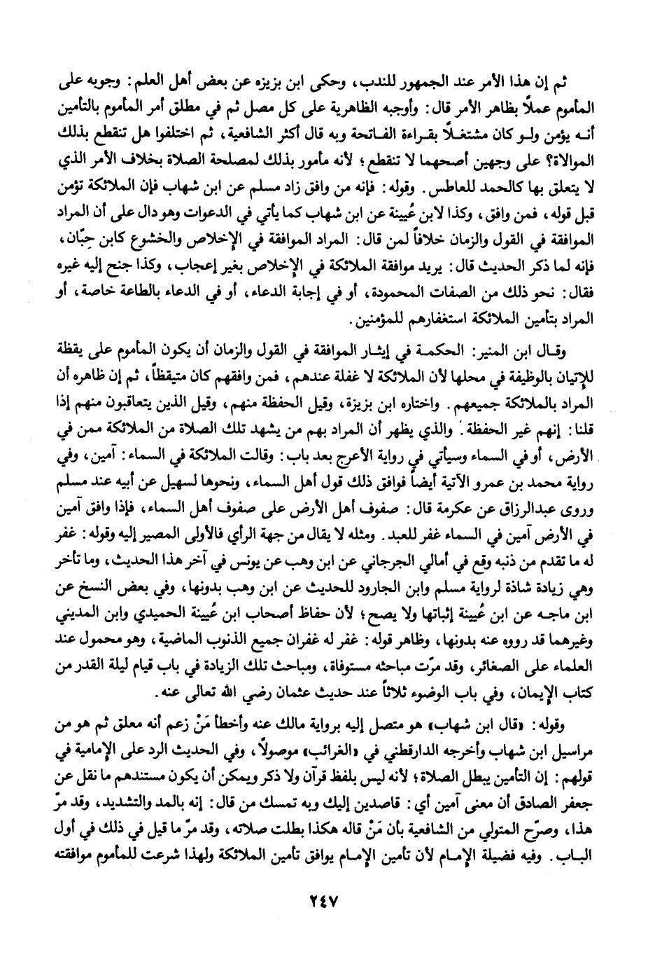 وقال ابن المنير: الحكمة في إيثار الموافقة في القول والزمان أن يكون المأموم على يقظة للإتيان بالوظيفة في محلها لأن الملائكة لا غفلة عندهم، فمن وافقهم كان متيقظًا، ثم إن ظاهره أن المراد بالملائكة جميعهم. واختاره ابن بزيزة، وقيل الحفظة منهم، وقيل الذين يتعاقبون منهم إذا قلنا: إنهم غير الحفظة. والذي يظهر أن المراد بهم من يشهد تلك الصلاة من الملائكة ممن في الأرض، أو في السماء وسيأتي في رواية الأعرج بعد باب: وقالت الملائكة في السماء: آمين، وفي رواية محمد بن عمرو الآتية أيضًا فوافق ذلك قول أهل السماء، ونحوها لسهيل عن أبيه عند مسلم وروى عبد الرزاق عن عكرمة قال: صفوف أهل الأرض على صفوف أهل السماء، فإذا وافق آمين في الأرض آمين في السماء غفر للعبد. ومثله لا يقال من جهة الرأي فالأولى المصير إليه وقوله: غفر له ما تقدم من ذنبه وقع في أمالي الجرجاني عن ابن وهب عن يونس في آخر هذا الحديث، وما تأخر وهي زيادة شاذة لرواية مسلم وابن الجارود للحديث عن ابن وهب بدونها، وفي بعض النسخ عن ابن ماجه عن ابن عُيينة إثباتها ولا يصح؛ لأن حفاظ أصحاب ابن عُيينة الحميدي وابن المديني وغيرهما قد رووه عنه بدونها، وظاهر قوله: غفر له غفران جميع الذنوب الماضية، وهو محمول عند العلماء على الصغائر، وقد مرّت مباحثه مستوفاة، ومباحث تلك الزيادة في باب قيام ليلة القدر من كتاب الإيمان، وفي باب الوضوء ثلاثًا عند حديث عثمان رضي الله تعالى عنه.