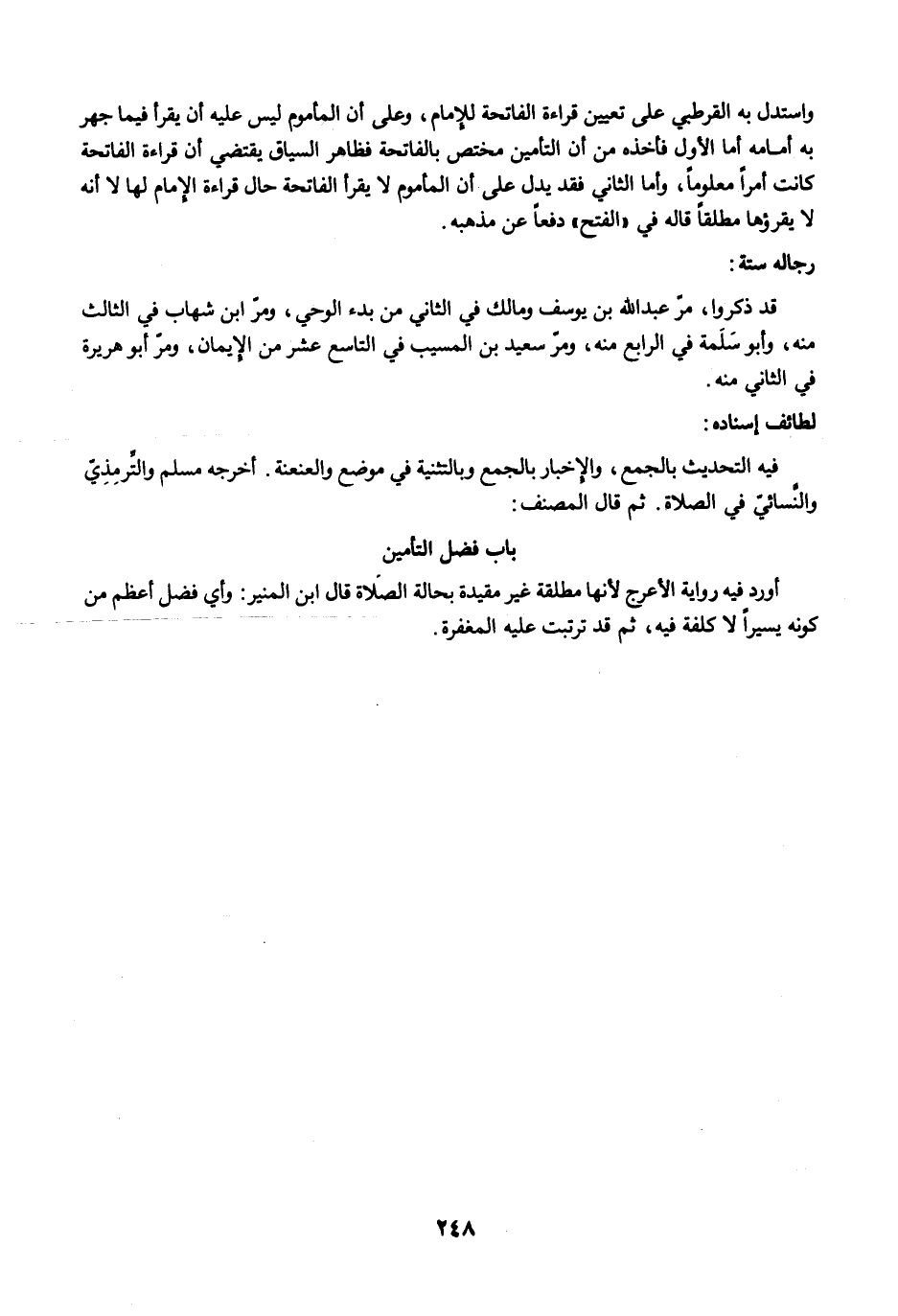 واستدل به القرطبي على تعيين قراءة الفاتحة للإمام، وعلى أن المأموم ليس عليه أن يقرأ فيما جهر به أمامه أما الأول فأخذه من أن التأمين مختص بالفاتحة فظاهر السياق يقتضي أن قراءة الفاتحة كانت أمرًا معلومًا، وأما الثاني فقد يدل على أن المأموم لا يقرأ الفاتحة حال قراءة الإِمام لها لا أنه لا يقرؤها مطلقًا قاله في "الفتح" دفعًا عن مذهبه.