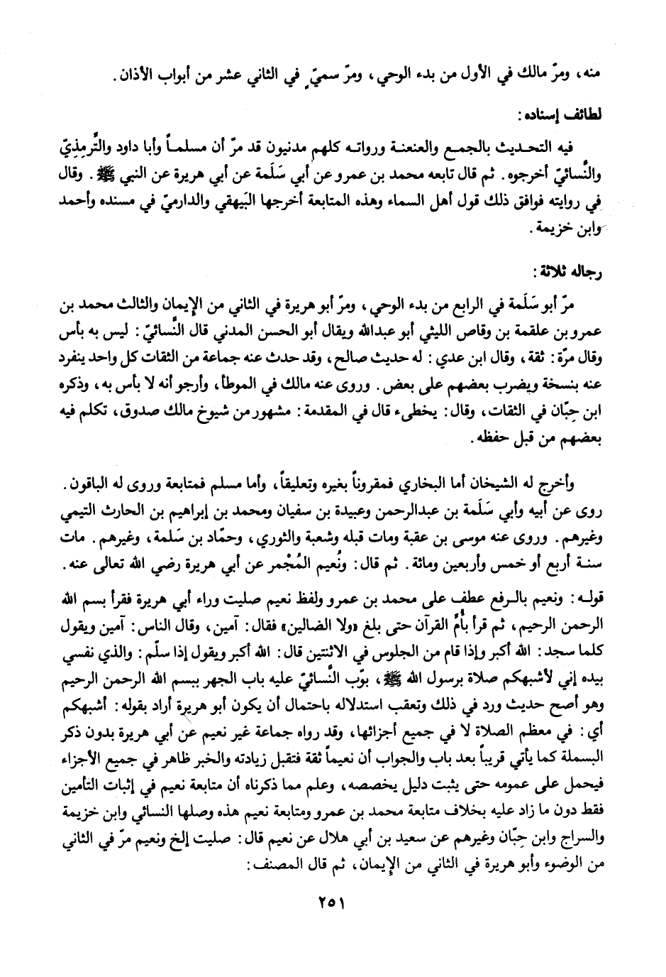 وأخرج له الشيخان أما البخاري فمقرونًا بغيره وتعليقًا، وأما مسلم فمتابعة وروى له الباقون. روى عن أبيه وأبي سَلَمة بن عبد الرحمن وعبيدة بن سفيان ومحمد بن إبراهيم بن الحارث التيمي وغيرهم. وروى عنه موسى بن عقبة ومات قبله وشعبة والثوري، وحمّاد بن سَلمة، وغيرهم. مات سنة أربع أو خمس وأربعين ومائة. ثم قال: ونُعيم المُجْمر عن أبي هريرة رضي الله تعالى عنه. قوله: ونعيم بالرفع عطف على محمد بن عمرو ولفظ نعيم صليت وراء أبي هريرة فقرأ بسم الله الرحمن الرحيم، ثم قرأ بأُمِّ القرآن حتى بلغ "ولا الضالين" فقال: آمين، وقال الناس: آمين ويقول كلما سجد: الله أكبر وإذا قام من الجلوس في الاثنتين قال: الله أكبر ويقول إذا سلّم: والذي نفسي بيده إني لأشبهكم صلاة برسول الله -صلى الله عليه وسلم-، بوّب النَّسائيّ عليه باب الجهر ببسم الله الرحمن الرحيم وهو أصح حديث ورد في ذلك وتعقب استدلاله باحتمال أن يكون أبو هريرة أراد بقوله: أشبهكم أي: في معظم الصلاة لا في جميع أجزائها، وقد رواه جماعة غير نعيم عن أبي هريرة بدون ذكر البسملة كما يأتي قريبًا بعد باب والجواب أن نعيمًا ثقة فتقبل زيادته والخبر ظاهر في جميع الأجزاء فيحمل على عمومه حتى يثبت دليل يخصصه، وعلم مما ذكرناه أن متابعة نعيم في إثبات التأمين فقط دون ما زاد عليه بخلاف متابعة محمد بن عمرو ومتابعة نعيم هذه وصلها النسائي وابن خزيمة والسراج وابن حِبّان وغيرهم عن سعيد بن أبي هلال عن نعيم قال: صليت إلخ ونعيم مرّ في الثاني من الوضوء وأبو هريرة في الثاني من الإيمان، ثم قال المصنف: