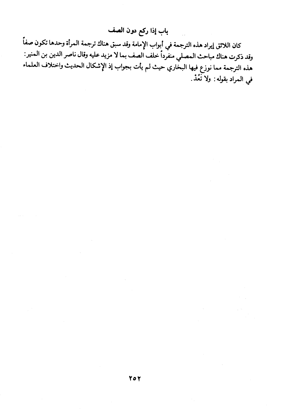 كان اللائق إيراد هذه الترجمة في أبواب الإمامة وقد سبق هناك ترجمة المرأة وحدها تكون صفًا وقد ذكرت هناك مباحث المصلي منفردًا خلف الصف بما لا مزيد عليه وقال ناصر الدين بن المنير: هذه الترجمة مما نوزع فيها البخاري حيث لم يأت بجواب إذ الإشكال الحديث واختلاف العلماء في المراد بقوله: ولا تَعُدْ.