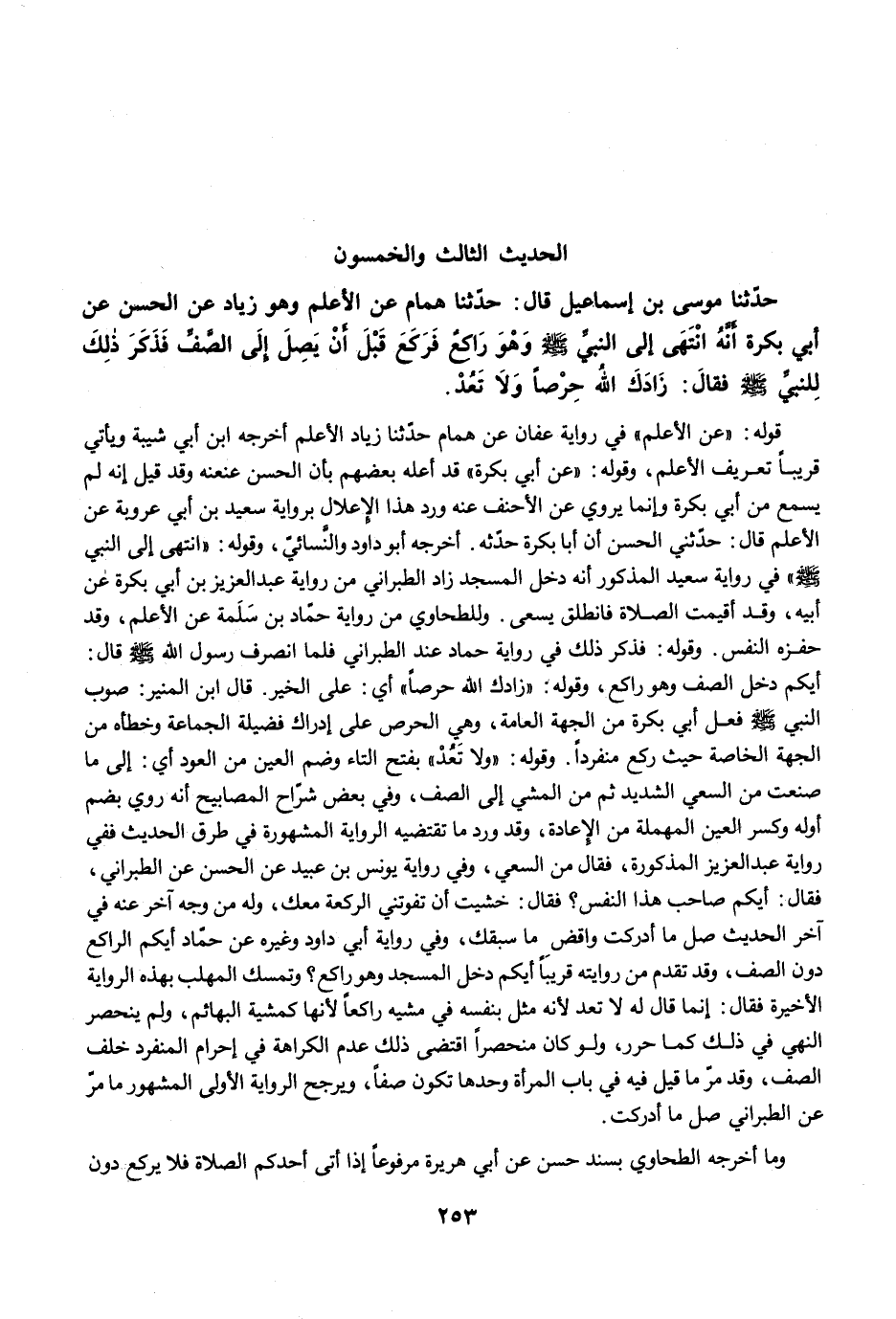 حَدَّثَنَا مُوسَى بْنُ إِسْمَاعِيلَ قَالَ: حَدَّثَنَا هَمَّامٌ عَنِ الأَعْلَمِ وَهْوَ زِيَادٌ عَنِ الْحَسَنِ عَنْ أَبِي بَكْرَةَ أَنَّهُ انْتَهَى إِلَى النَّبِيِّ -صلى الله عليه وسلم- وَهْوَ رَاكِعٌ، فَرَكَعَ قَبْلَ أَنْ يَصِلَ إِلَى الصَّفِّ، فَذَكَرَ ذَلِكَ لِلنَّبِيِّ -صلى الله عليه وسلم- فَقَالَ: زَادَكَ اللَّهُ حِرْصًا وَلاَ تَعُدْ.