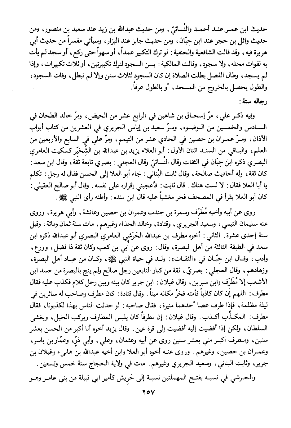 روى عن أبيه وأخيه مُطَرّف وسمرة بن جندب وعمران بن حصين وعائشة، وأبي هريرة، وروى عنه سليمان التيمي، وسعيد الجريري، وقتادة، وخالد الحذاء وغيرهم، مات سنة ثمان ومائة، وقيل سنة إحدى عشرة. الثاني: أخوه مطرف بن عبد الله الحَرَشي في العامري البصري أبو عبد الله ذكره ابن سعد في الطبقة الثالثة من أهل البصرة، وقال: روى عن أبي بن كعب وكان ثقة ذا فضل، وورع، وأدب، وقال ابن حِبّان في "الثقات": ولد في حياة النبي -صلى الله عليه وسلم-، وكان من عباد أهل البصرة، وزهادهم، وقال العجلي: بصريّ، ثقة من كبار التابعين رجل صالح ولم ينج بالبصرة من حسد ابن الأشعب إلا مُطَرّف وابن سيرين، وقال غيلان: ابن جرير كان بينه وبين رجل كلام فكذب عليه فقال مطرت: اللهم إن كان كاذبًا فأمته فخرَّ مكانه ميتًا. وقال قتادة: كان مطرف وصاحب له سائرين في ليلة مظلمة، فإذا طرف عصا أحدهما منيرة، فقال صاحبه: لو حدثت الناس بهذا لكذبونا، فقال مطرف: المكذِّب أكذب. وقال غيلان: إن مطرفًا كان يلبس المطارف ويركب الخيل، ويغشى السلطان، ولكن إذا أفضيت إليه أفضيت إلى قرة عين. وقال يزيد أخوه أنا أكبر من الحسن بعشر سنين، ومطرف أكبر مني بعشر سنين روى عن أبيه وعثمان، وعلي، وأبي ذرٍّ، وعمّار بن ياسر، وعمران بن حصين، وغيرهم. وروى عنه أخوه أبو العلا وابن أخيه عبد الله بن هانىء وغيلان بن جرير، وثابت البناني، وسعيد الجريري وغيرهم. مات في ولاية الحجاج سنة خمس وتسعين.