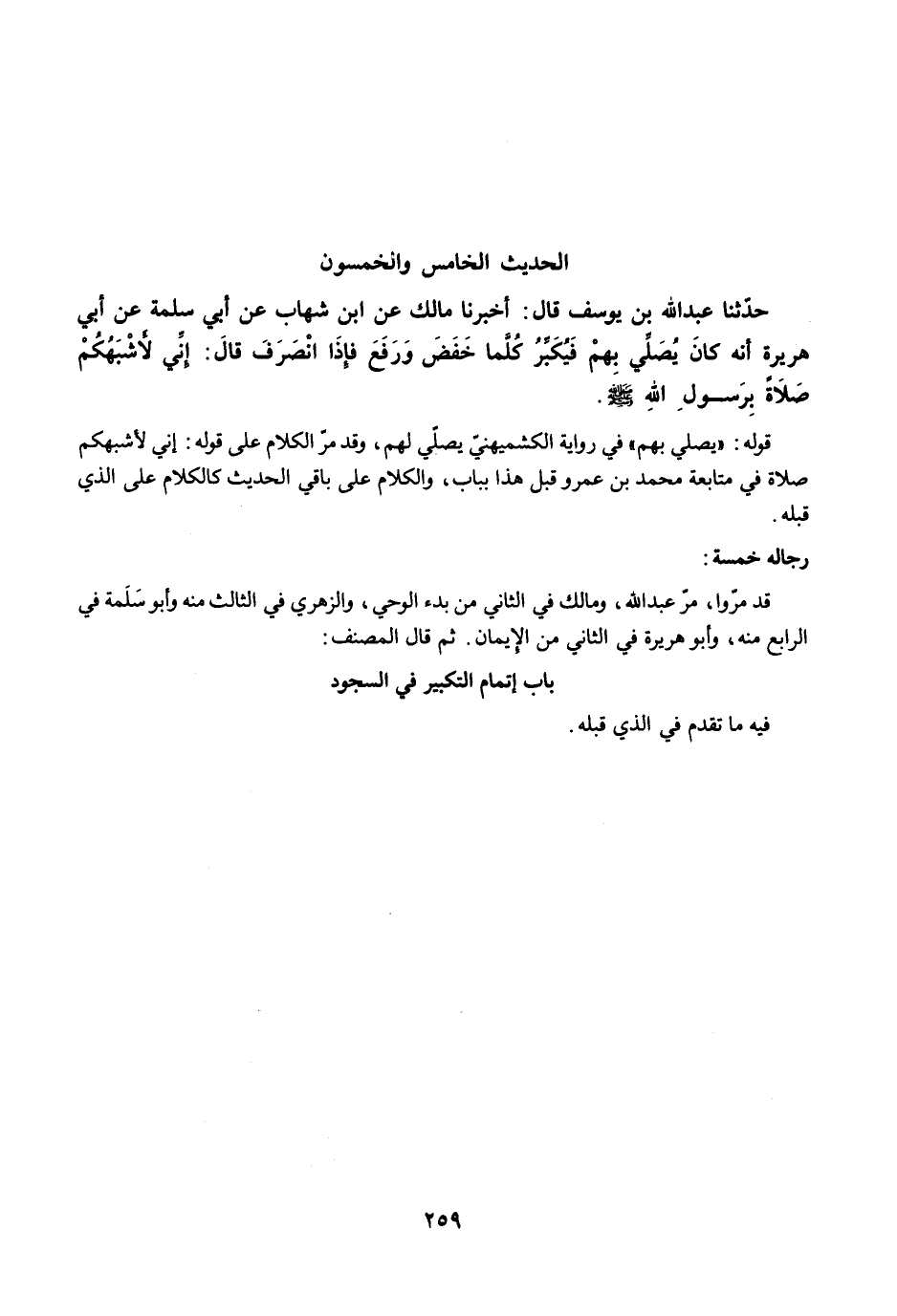 حَدَّثَنَا عَبْدُ اللَّهِ بْنُ يُوسُفَ قَالَ: أَخْبَرَنَا مَالِكٌ عَنِ ابْنِ شِهَابٍ عَنْ أَبِي سَلَمَةَ عَنْ أَبِي هُرَيْرَةَ أَنَّهُ كَانَ يُصَلِّي بِهِمْ، فَيُكَبِّرُ كُلَّمَا خَفَضَ وَرَفَعَ، فَإِذَا انْصَرَفَ قَالَ: إِنِّي لأَشْبَهُكُمْ صَلاَةً بِرَسُولِ اللَّهِ -صلى الله عليه وسلم-.