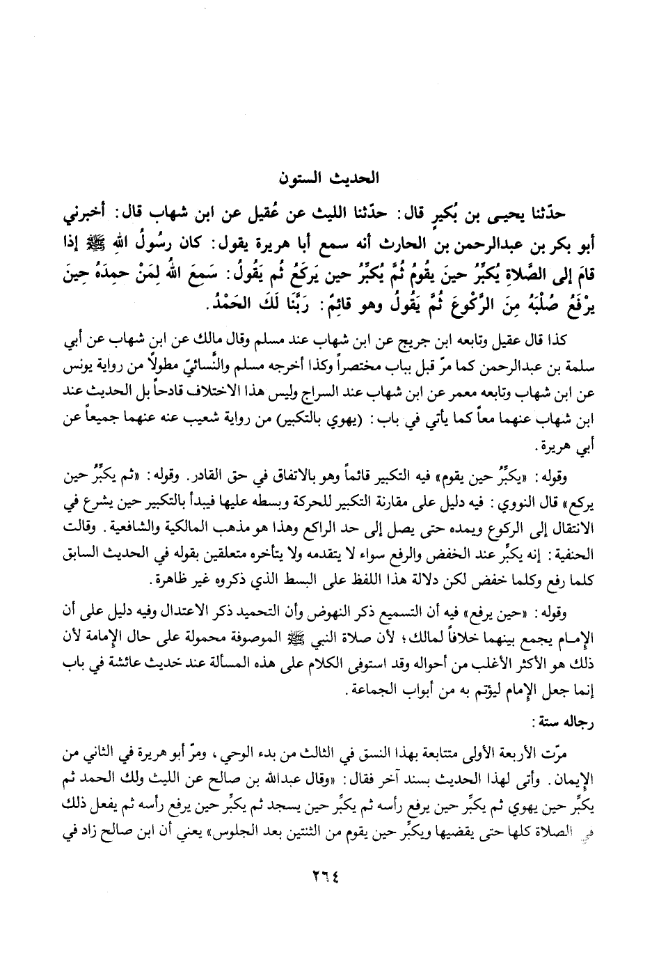مرّت الأربعة الأولى متتابعة بهذا النسق في الثالث من بدء الوحي، ومرّ بو هريرة في الثاني من الإيمان. وأتى لهذا الحديث بسند آخر فقال: "وقال عبد الله بن صالح عن الليث ولك الحمد ثم يكبِّر حين يهوي ثم يكبِّر حين يرفع رأسه ثم يكبِّر حين يسجد ثم يكبِّر حين يرفع رأسه ثم يفعل ذلك وفي الصلاة لمحلها حتى يقضيها ويكبِّر حين يقوم من الثنتين بعد الجلوس" يعني أن ابن صالح زاد في
