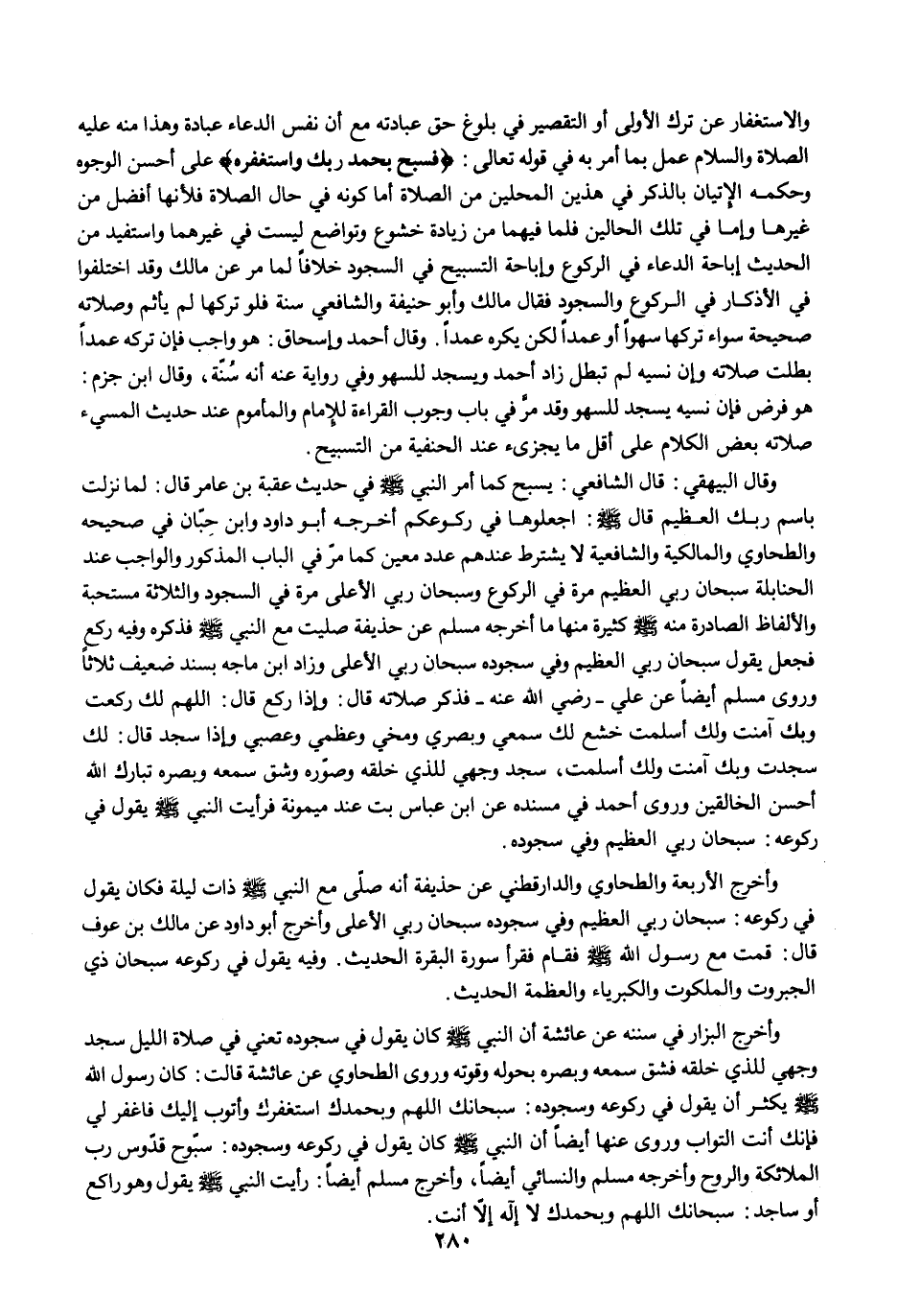وقال البيهقي: قال الشافعي: يسبح كما أمر النبي -صلى الله عليه وسلم- في حديث عقبة بن عامر قال: لما نزلت باسم ربك العظيم قال -صلى الله عليه وسلم-: اجعلوها في ركوعكم أخرجه أبو داود وابن حِبّان في صحيحه والطحاوي والمالكية والشافعية لا يشترط عندهم عدد معين كما مرّ في الباب المذكور والواجب عند الحنابلة سبحان ربي العظيم مرة في الركوع وسبحان ربي الأعلى مرة في السجود والثلاثة مستحبة والألفاظ الصادرة منه -صلى الله عليه وسلم- كثيرة منها ما أخرجه مسلم عن حذيفة صليت مع النبي -صلى الله عليه وسلم- فذكره وفيه ركع فجعل يقول سبحان ربي العظيم وفي سجوده سبحان ربي الأعلى وزاد ابن ماجه بسند ضعيف ثلاثًا وروى مسلم أيضًا عن علي -رضي الله عنه- فذكر صلاته قال: وإذا ركع قال: اللهم لك ركعت وبك آمنت ولك أسلمت خشع لك سمعي وبصري ومخي وعظمي وعصبي وإذا سجد قال: لك سجدت وبك آمنت ولك أسلمت، سجد وجهي للذي خلقه وصوّره وشق سمعه وبصره تبارك الله أحسن الخالقين وروى أحمد في مسنده عن ابن عباس بت عند ميمونة فرأيت النبي -صلى الله عليه وسلم- يقول في ركوعه: سبحان ربي العظيم وفي سجوده.