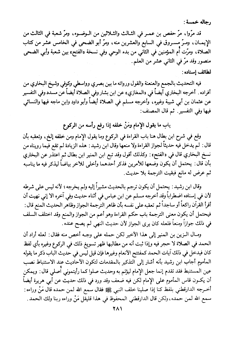 وقال ابن رشيد: يحتمل أن يكون ترجم بالحديث مشيرًا إليه ولم يخرجه؛ لأنه ليس على شرطه لأن في إسناده اضطرابًا وقد أخرجه مسلم عن ابن عباس في أثناء حديث وفي آخره إلا إني نهيت أن أقرأ القرآن راكعًا أو ساجدًا ثم تعقبه على نفسه بأن ظاهر الترجمة الجواز وظاهر الحديث المنع قال: فيحتمل أن يكون معنى الترجمة باب حكم القراءة وهو أعم من الجواز والمنع وقد اختلف السلف في ذلك جوازًا ومنعًا فلعله كان يرى الجواز لأن حديث النهي لم يصح عنده.