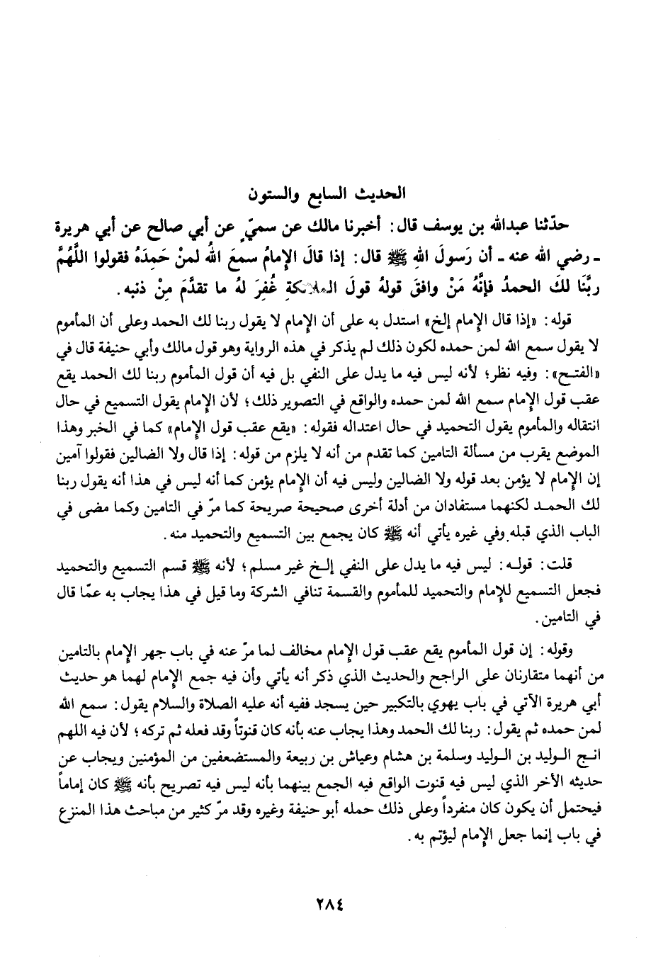حَدَّثَنَا عَبْدُ اللَّهِ بْنُ يُوسُفَ قَالَ: أَخْبَرَنَا مَالِكٌ عَنْ سُمَيٍّ عَنْ أَبِي صَالِحٍ عَنْ أَبِي هُرَيْرَةَ -رضى الله عنه- أَنَّ رَسُولَ اللَّهِ -صلى الله عليه وسلم- قَالَ: إِذَا قَالَ الإِمَامُ سَمِعَ اللَّهُ لِمَنْ حَمِدَهُ. فَقُولُوا اللَّهُمَّ رَبَّنَا لَكَ الْحَمْدُ. فَإِنَّهُ مَنْ وَافَقَ قَوْلُهُ قَوْلَ الْمَلاَئِكَةِ غُفِرَ لَهُ مَا تَقَدَّمَ مِنْ ذَنْبِهِ.