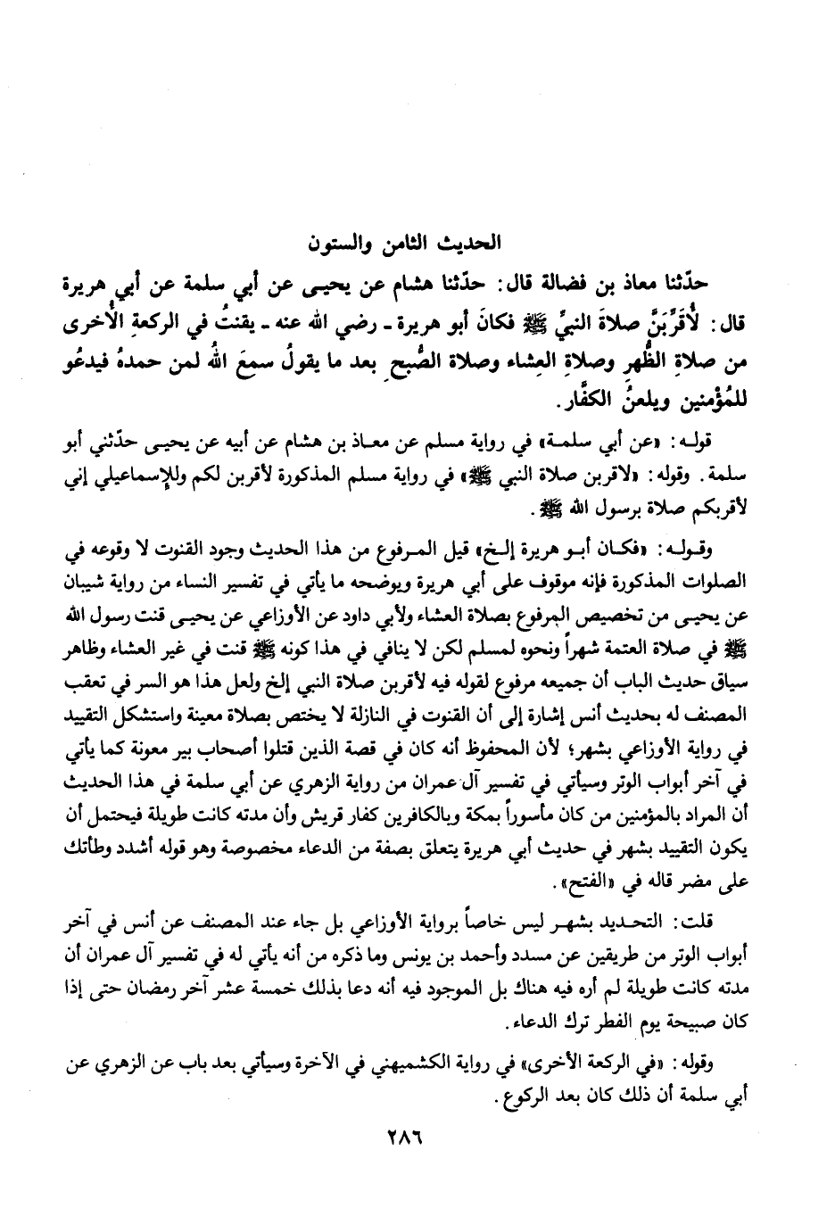 حَدَّثَنَا مُعَاذُ بْنُ فَضَالَةَ قَالَ: حَدَّثَنَا هِشَامٌ عَنْ يَحْيَى عَنْ أَبِي سَلَمَةَ عَنْ أَبِي هُرَيْرَةَ قَالَ: لأُقَرِّبَنَّ صَلاَةَ النَّبِيِّ -صلى الله عليه وسلم-. فَكَانَ أَبُو هُرَيْرَةَ -رضى الله عنه- يَقْنُتُ فِي الرَّكْعَةِ الآخِرَةِ مِنْ صَلاَةِ الظُّهْرِ وَصَلاَةِ الْعِشَاءِ، وَصَلاَةِ الصُّبْحِ، بَعْدَمَا يَقُولُ سَمِعَ اللَّهُ لِمَنْ حَمِدَهُ. فَيَدْعُو لِلْمُؤْمِنِينَ وَيَلْعَنُ الْكُفَّارَ.