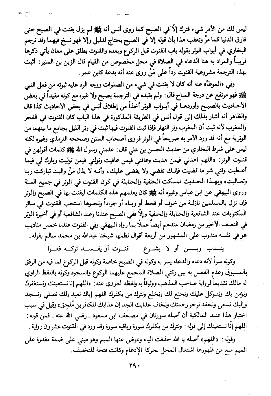 وكونه سرًا لأنه دعاء والدعاء يسر به وكونه في الصبح خاصة وكونه قبل الركوع لما فيه من الرفق بالمسبوق وعدم الفصل به بين ركني الصلاة المجمع عليهما الركوع والسجود وكونه باللفظ الراوي له مالك تقديمًا لرواية صاحب المذهب ووثوقًا به ولفظه المروي عنه: "اللهم إنا نستعينك ونستغفرك ونؤمن بك ونتوكل عليك ونخنع لك ونخلع ونترك من يكفرك اللهم إياك نعبد ولك نصلي ونسجد وإليك نسعى ونحفد نرجو رحمتك ونخاف عذابك الجد إِن عذابك للكافرين مُلحِق" وقيل في سبب اختيار هذا عند المالكية أن أصله سورتان في مصحَف ابن مسعود -رضي الله عنه- فمن قوله: اللهم إِنّا نستعينك إلى قوله: ونترك من يكفرك سورة وباقيه سورة وقد ورد في القنوت عشرون رواية.