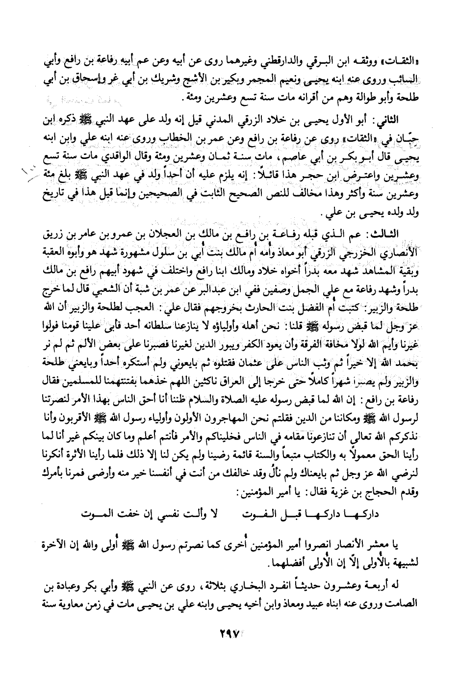الثالث: عم الذي قبله رفاعة بن رافع بن مالك بن العجلان بن عمرو بن عامر بن زريق الأنصاري الخزرجي الزرقي أبو معاذ وأُمه أُم مالك بنت أُبي بن سلول مشهورة شهد هو وأبوه العقبة وبقية المشاهد شهد معه بدرًا أخواه خلاد ومالك ابنا رافع واختلف في شهود أبيهم رافع بن مالك بدرًا وشهد رفاعة مع علي الجمل وصفين ففي ابن عبد البر عن عمر بن شبة أن الشعبي قال لما خرج طلحة والزبير: كتبت أُم الفضل بنت الحارث بخروجهم فقال علي: العجب لطلحة والزبير أن الله عَزَّ وَجَلَّ لما قبض رسوله -صلى الله عليه وسلم- قلنا: نحن أهله وأولياؤه لا ينازعنا سلطانه أحد فأبى علينا قومنا فولوا غيرنا وأيم الله لولا مخافة الفرقة وأن يعود الكفر ويبور الدين لغيرنا فصبرنا على بعض الألم ثم لم نر بحمد الله إلا خيرًا ثم وثب الناس على عثمان فقتلوه ثم بايعوني ولم أستكره أحدًا وبايعني طلحة والزبير ولم يصبرا شهرًا كاملًا حتى خرجا إلى العراق ناكثين اللهم خذهما بفتنتهما للمسلمين فقال رفاعة بن رافع: إن الله لما قبض رسوله عليه الصلاة والسلام ظننا أنا أحق الناس بهذا الأمر لنصرتنا لرسول الله -صلى الله عليه وسلم- ومكاننا من الدين فقلتم نحن المهاجرون الأولون وأولياء رسول الله -صلى الله عليه وسلم- الأقربون وأنا نذكركم الله تعالى أن تنازعونا مقامه في الناس فخليناكم والأمر فأنتم أعلم وما كان بينكم غير أنا لما رأينا الحق معمولًا به والكتاب متبعًا والسنة قائمة رضينا ولم يكن لنا إلا ذلك فلما رأينا الأثرة أنكرنا لنرضي الله عَزَّ وَجَلَّ ثم بايعناك ولم نألُ وقد خالفك من أنت في أنفسنا خير منه وأرضى فمرنا بأمرك وقدم الحجاج بن غزية فقال: يا أمير المؤمنين: