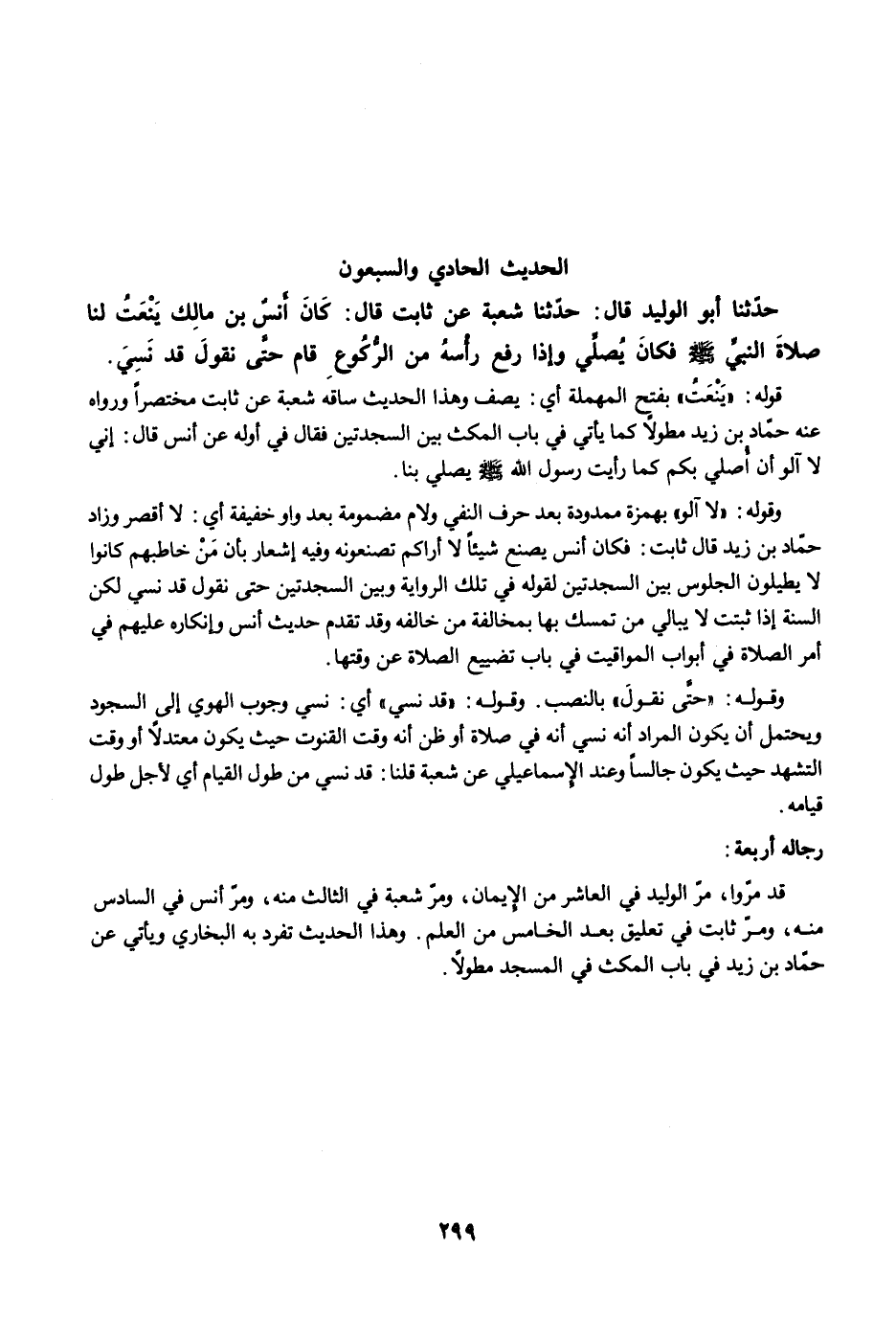 قد مرّوا، مرّ الوليد في العاشر من الإِيمان, ومرّ شعبة في الثالث منه، ومرّ أنس في السادس منه، ومرّ ثابت في تعليق بعد الخامس من العلم. وهذا الحديث تفرد به البخاري ويأتي عن حمّاد بن زيد في باب المكث في المسجد مطولًا.