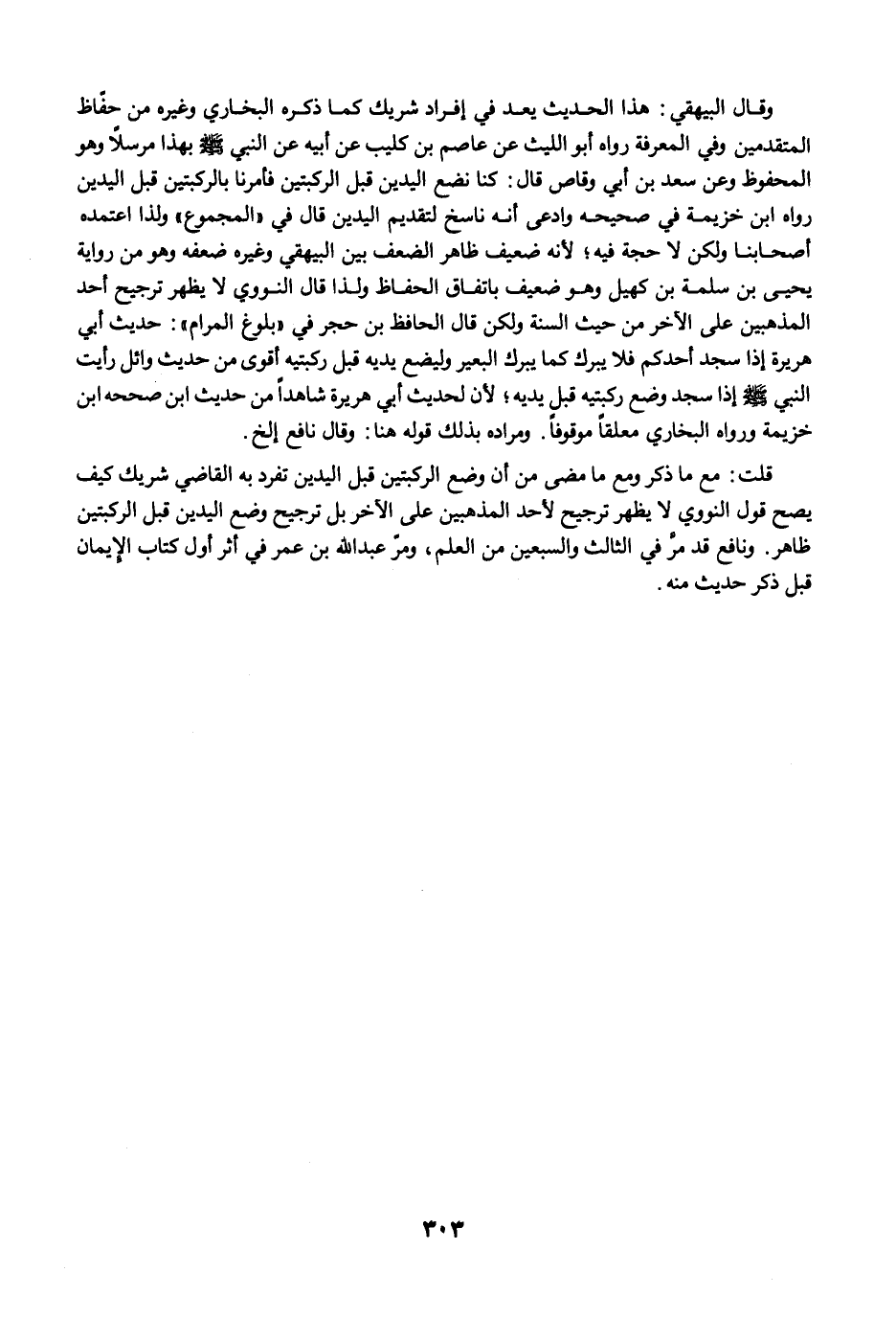 وقال البيهقي: هذا الحديث يعد في إفراد شريك كما ذكره البخاري وغيره من حفّاظ المتقدمين وفي المعرفة رواه أبو الليث عن عاصم بن كليب عن أبيه عن النبي -صلى الله عليه وسلم- بهذا مرسلًا وهو المحفوظ وعن سعد بن أبي وقاص قال: كنا نضع اليدين قبل الركبتين فأمرنا بالركبتين قبل اليدين رواه ابن خزيمة في صحيحه وادعى أنه ناسخ لتقديم اليدين قال في "المجموع" ولذا اعتمده أصحابنا ولكن لا حجة فيه؛ لأنه ضعيف ظاهر الضعف بين البيهقي وغيره ضعفه وهو من رواية يحيى بن سلمة بن كهيل وهو ضعيف باتفاق الحفاظ ولذا قال النووي لا يظهر ترجيح أحد المذهبين على الآخر من حيث السنة ولكن قال الحافظ بن حجر في "بلوغ المرام": حديث أبي هريرة إذا سجد أحدكم فلا يبرك كما يبرك البعير وليضع يديه قبل ركبتيه أقوى من حديث وائل رأيت النبي -صلى الله عليه وسلم- إذا سجد وضع ركبتيه قبل يديه؛ لأن لحديث أبي هريرة شاهدًا من حديث ابن صححه ابن خزيمة ورواه البخاري معلقًا موقوفًا. ومراده بذلك قوله هنا: وقال نافع الخ.