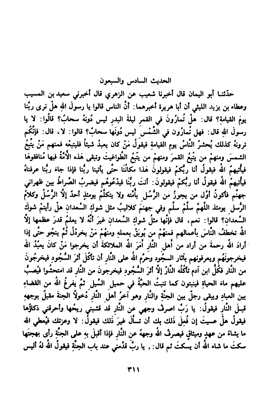 حَدَّثَنَا أَبُو الْيَمَانِ قَالَ أَخْبَرَنَا شُعَيْبٌ عَنِ الزُّهْرِيِّ قَالَ أَخْبَرَنِي سَعِيدُ بْنُ الْمُسَيَّبِ وَعَطَاءُ بْنُ يَزِيدَ اللَّيْثِيُّ أَنَّ أَبَا هُرَيْرَةَ أَخْبَرَهُمَا: أَنَّ النَّاسَ قَالُوا يَا رَسُولَ اللَّهِ، هَلْ نَرَى رَبَّنَا يَوْمَ الْقِيَامَةِ؟ قَالَ: هَلْ تُمَارُونَ فِي الْقَمَرِ لَيْلَةَ الْبَدْرِ لَيْسَ دُونَهُ سَحَابٌ؟. قَالُوا: لاَ يَا رَسُولَ اللَّهِ. قَالَ: فَهَلْ تُمَارُونَ فِي الشَّمْسِ لَيْسَ دُونَهَا سَحَابٌ؟. قَالُوا: لاَ. قَالَ: فَإِنَّكُمْ تَرَوْنَهُ كَذَلِكَ، يُحْشَرُ النَّاسُ يَوْمَ الْقِيَامَةِ، فَيَقُولُ مَنْ كَانَ يَعْبُدُ شَيْئًا فَلْيَتَّبِعْه. فَمِنْهُمْ مَنْ يَتَّبِعُ الشَّمْسَ، وَمِنْهُمْ مَنْ يَتَّبِعُ الْقَمَرَ وَمِنْهُمْ مَنْ يَتَّبِعُ الطَّوَاغِيتَ، وَتَبْقَى هَذِهِ الأُمَّةُ فِيهَا مُنَافِقُوهَا، فَيَأْتِيهِمُ اللَّهُ فَيَقُولُ أَنَا رَبُّكُمْ فَيَقُولُونَ هَذَا مَكَانُنَا حَتَّى يَأْتِيَنَا رَبُّنَا، فَإِذَا جَاءَ رَبُّنَا عَرَفْنَاهُ. فَيَأْتِيهِمُ اللَّهُ فَيَقُولُ أَنَا رَبُّكُمْ. فَيَقُولُونَ: أَنْتَ رَبُّنَا. فَيَدْعُوهُمْ فَيُضْرَبُ الصِّرَاطُ بَيْنَ ظَهْرَانَيْ جَهَنَّمَ، فَأَكُونُ أَوَّلَ مَنْ يَجُوزُ مِنَ الرُّسُلِ بِأُمَّتِهِ، وَلاَ يَتَكَلَّمُ يَوْمَئِذٍ أَحَدٌ إِلاَّ الرُّسُلُ، وَكَلاَمُ الرُّسُلِ يَوْمَئِذٍ اللَّهُمَّ سَلِّمْ سَلِّمْ. وَفِى جَهَنَّمَ كَلاَلِيبُ مِثْلُ شَوْكِ السَّعْدَانِ، هَلْ رَأَيْتُمْ شَوْكَ السَّعْدَانِ؟. قَالُوا: نَعَمْ. قَالَ: فَإِنَّهَا مِثْلُ شَوْكِ السَّعْدَانِ، غَيْرَ أَنَّهُ لاَ يَعْلَمُ قَدْرَ عِظَمِهَا إِلاَّ اللَّهُ، تَخْطَفُ النَّاسَ بِأَعْمَالِهِمْ، فَمِنْهُمْ مَنْ يُوبَقُ بِعَمَلِهِ، وَمِنْهُمْ مَنْ يُخَرْدَلُ ثُمَّ يَنْجُو، حَتَّى إِذَا أَرَادَ اللَّهُ رَحْمَةَ مَنْ أَرَادَ مِنْ أَهْلِ النَّارِ، أَمَرَ اللَّهُ الْمَلاَئِكَةَ أَنْ يُخْرِجُوا مَنْ كَانَ يَعْبُدُ اللَّهَ، فَيُخْرِجُونَهُمْ وَيَعْرِفُونَهُمْ بِآثَارِ السُّجُودِ، وَحَرَّمَ اللَّهُ عَلَى النَّارِ أَنْ تَأْكُلَ أَثَرَ السُّجُودِ فَيَخْرُجُونَ مِنَ النَّارِ، فَكُلُّ ابْنِ آدَمَ تَأْكُلُهُ النَّارُ إِلاَّ أَثَرَ السُّجُودِ، فَيَخْرُجُونَ مِنَ النَّارِ قَدِ امْتَحَشُوا، فَيُصَبُّ عَلَيْهِمْ مَاءُ الْحَيَاةِ، فَيَنْبُتُونَ كَمَا تَنْبُتُ الْحِبَّةُ فِي حَمِيلِ السَّيْلِ، ثُمَّ يَفْرُغُ اللَّهُ مِنَ الْقَضَاءِ بَيْنَ الْعِبَادِ، وَيَبْقَى رَجُلٌ بَيْنَ الْجَنَّةِ وَالنَّارِ، وَهْوَ آخِرُ أَهْلِ النَّارِ دُخُولاً الْجَنَّةَ، مُقْبِلٌ بِوَجْهِهِ قِبَلَ النَّارِ فَيَقُولُ: يَا رَبِّ اصْرِفْ وَجْهِي عَنِ النَّارِ، قَدْ قَشَبَنِي رِيحُهَا، وَأَحْرَقَنِي ذَكَاؤُهَا. فَيَقُولُ هَلْ عَسَيْتَ إِنْ فُعِلَ ذَلِكَ بِكَ أَنْ تَسْأَلَ غَيْرَ ذَلِكَ فَيَقُولُ: لاَ وَعِزَّتِكَ. فَيُعْطِى اللَّهَ مَا يَشَاءُ مِنْ عَهْدٍ وَمِيثَاقٍ، فَيَصْرِفُ اللَّهُ وَجْهَهُ عَنِ النَّارِ، فَإِذَا أَقْبَلَ بِهِ عَلَى الْجَنَّةِ رَأَى بَهْجَتَهَا سَكَتَ مَا شَاءَ اللَّهُ أَنْ يَسْكُتَ، ثُمَّ قَالَ: يَا رَبِّ قَدِّمْنِي عِنْدَ بَابِ الْجَنَّةِ. فَيَقُولُ اللَّهُ لَهُ أَلَيْسَ