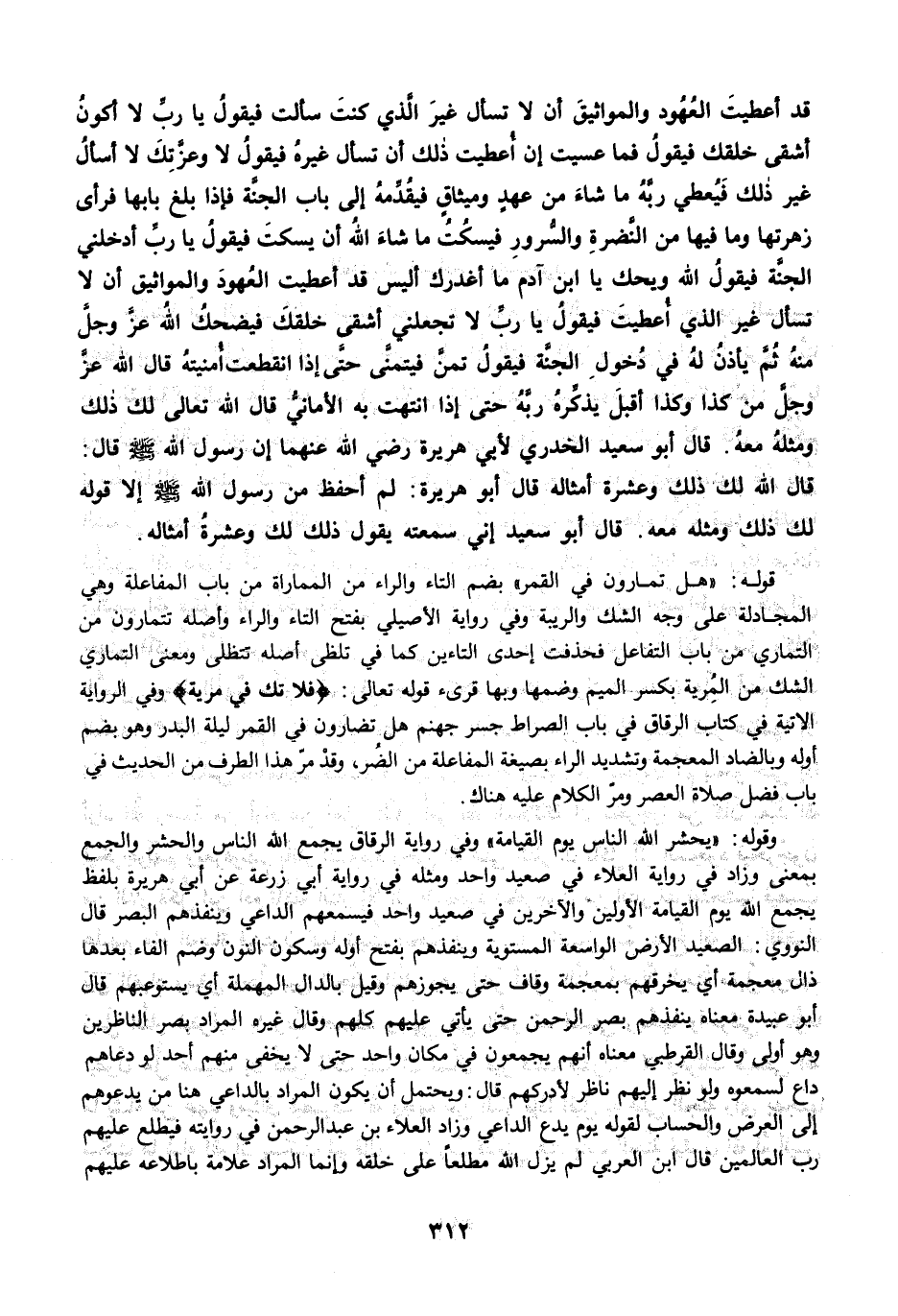 قَدْ أَعْطَيْتَ الْعُهُودَ وَالْمَوَاثِيقَ أَنْ لاَ تَسْأَلَ غَيْرَ الَّذِى كُنْتَ سَأَلْتَ فَيَقُولُ يَا رَبِّ لاَ أَكُونُ أَشْقَى خَلْقِكَ. فَيَقُولُ فَمَا عَسَيْتَ إِنْ أُعْطِيتَ ذَلِكَ أَنْ لاَ تَسْأَلَ غَيْرَهُ فَيَقُولُ لاَ وَعِزَّتِكَ لاَ أَسْأَلُ غَيْرَ ذَلِكَ. فَيُعْطِي رَبَّهُ مَا شَاءَ مِنْ عَهْدٍ وَمِيثَاقٍ، فَيُقَدِّمُهُ إِلَى بَابِ الْجَنَّةِ، فَإِذَا بَلَغَ بَابَهَا، فَرَأَى زَهْرَتَهَا وَمَا فِيهَا مِنَ النَّضْرَةِ وَالسُّرُورِ، فَيَسْكُتُ مَا شَاءَ اللَّهُ أَنْ يَسْكُتَ، فَيَقُولُ يَا رَبِّ أَدْخِلْنِي الْجَنَّةَ. فَيَقُولُ اللَّهُ وَيْحَكَ يَا ابْنَ آدَمَ مَا أَغْدَرَكَ، أَلَيْسَ قَدْ أَعْطَيْتَ الْعَهْدَ وَالْمِيثَاقَ أَنْ لاَ تَسْأَلَ غَيْرَ الَّذِى أُعْطِيتَ فَيَقُولُ يَا رَبِّ لاَ تَجْعَلْنِي أَشْقَى خَلْقِكَ. فَيَضْحَكُ اللَّهُ عَزَّ وَجَلَّ مِنْهُ، ثُمَّ يَأْذَنُ لَهُ فِي دُخُولِ الْجَنَّةِ فَيَقُولُ تَمَنَّ. فَيَتَمَنَّى حَتَّى إِذَا انْقَطَعَتْ أُمْنِيَّتُهُ قَالَ اللَّهُ عَزَّ وَجَلَّ تَمَنَّ كَذَا وَكَذَا. أَقْبَلَ يُذَكِّرُهُ رَبُّهُ، حَتَّى إِذَا انْتَهَتْ بِهِ الأَمَانِيُّ قَالَ اللَّهُ تَعَالَى لَكَ ذَلِكَ وَمِثْلُهُ مَعَهُ. قَالَ أَبُو سَعِيدٍ الْخُدْرِيُّ لأَبِى هُرَيْرَةَ رضي الله عنهما إِنَّ رَسُولَ اللَّهِ -صلى الله عليه وسلم- قَالَ: قَالَ اللَّهُ لَكَ ذَلِكَ وَعَشَرَةُ أَمْثَالِهِ. قَالَ أَبُو هُرَيْرَةَ: لَمْ أَحْفَظْ مِنْ رَسُولِ اللَّهِ -صلى الله عليه وسلم- إِلاَّ قَوْلَهُ لَكَ ذَلِكَ وَمِثْلُهُ مَعَهُ. قَالَ أَبُو سَعِيدٍ إِنِّي سَمِعْتُهُ يَقُولُ ذَلِكَ لَكَ وَعَشَرَةُ أَمْثَالِهِ.
