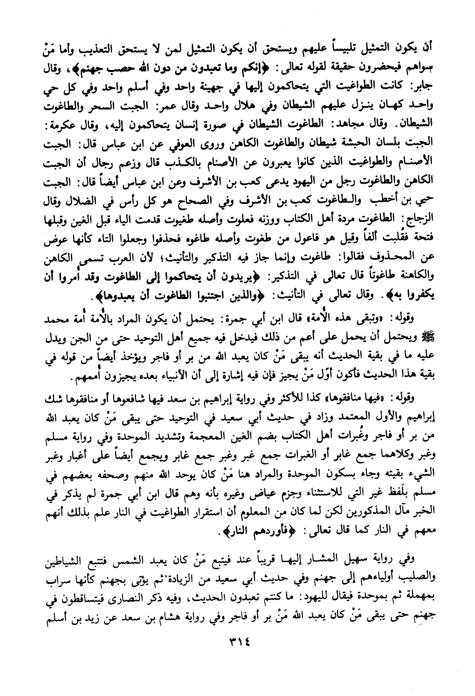 أن يكون التمثيل تلبيسًا عليهم ويستحق أن يكون التمثيل لمن لا يستحق التعذيب وأما مَنْ سواهم فيحضرون حقيقة لقوله تعالى: {إِنَّكُمْ وَمَا تَعْبُدُونَ مِنْ دُونِ اللَّهِ حَصَبُ جَهَنَّمَ}، وقال جابر: كانت الطواغيت التي يتحاكمون إِليها في جهينة واحد وفي أسلم واحد وفي كل حي واحد كهان ينزل عليهم الشيطان وفي هلال واحد وقال عمر: الجبت السحر والطاغوت الشيطان. وقال مجاهد: الطاغوت الشيطان في صورة إِنسان يتحاكمون إِليه، وقال عكرمة: الجبت بلسان الحبشة شيطان والطاغوت الكاهن وروى العوفي عن ابن عباس قال: الجبت الأصنام والطواغيت الذين كانوا يعبرون عن الأصنام بالكذب قال وزعم رجال أن الجبت الكاهن والطاغوت رجل من اليهود يدعى كعب بن الأشرف وعن ابن عباس أيضًا قال: الجبت حيي بن أخطب والطاغوت كعب بن الأشرف وفي الصحاح هو كل رأس في الضلال وقال الزجاج: الطاغوت مردة أهل الكتاب ووزنه فعلوت وأصله طغيوت قدمت الياء قبل الغين وقبلها فتحة فقُلبت ألفًا وقيل هو فاعول من طغوت وأصله طاغوه فحذفوا وجعلوا التاء كأنها عوض عن المحذوف فقالوا: طاغوت وإنما جاز فيه التذكير والتأنيث؛ لأن العرب تسمى الكاهن والكاهنة طاغوتًا قال تعالى في التذكير: {يُرِيدُونَ أَنْ يَتَحَاكَمُوا إِلَى الطَّاغُوتِ وَقَدْ أُمِرُوا أَنْ يَكْفُرُوا بِهِ}. وقال تعالى في التأنيث: {وَالَّذِينَ اجْتَنَبُوا الطَّاغُوتَ أَنْ يَعْبُدُوهَا}.
