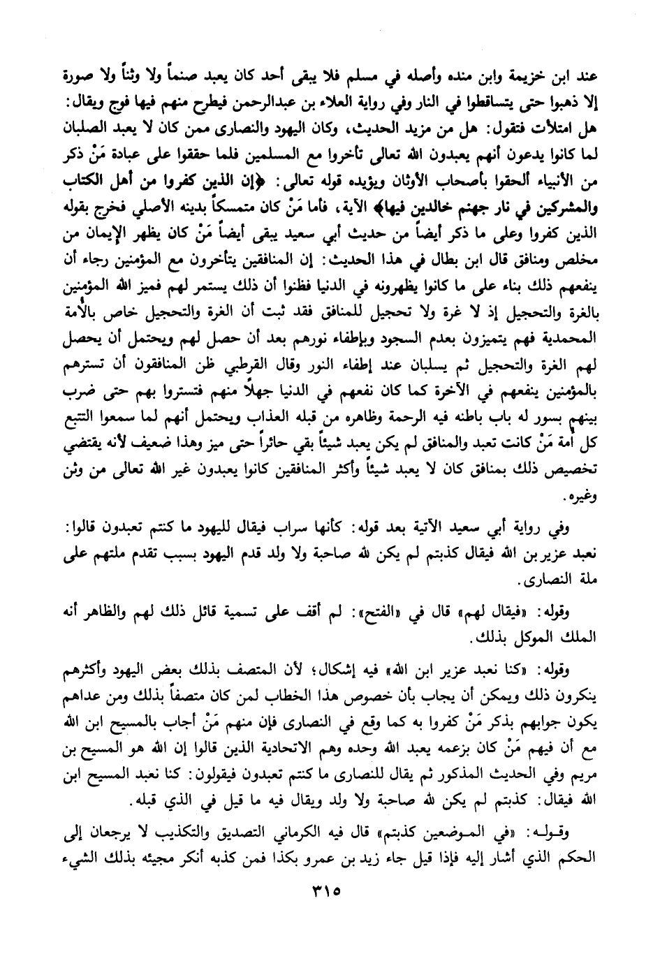 وقوله: "كنا نعبد عزير ابن الله" فيه إشكال؛ لأن المتصف بذلك بعض اليهود وأكثرهم ينكرون ذلك ويمكن أن يجاب بأن خصوص هذا الخطاب لمن كان متصفًا بذلك ومن عداهم يكون جوابهم بذكر مَنْ كفروا به كما وقع في النصارى فإن منهم مَنْ أجاب بالمسيح ابن الله مع أن فيهم مَنْ كان بزعمه يعبد الله وحده وهم الاتحادية الذين قالوا إن الله هو المسيح بن مريم وفي الحديث المذكور ثم يقال للنصارى ما كنتم تعبدون فيقولون: كنا نعبد المسيح ابن الله فيقال: كذبتم لم يكن لله صاحبة ولا ولد ويقال فيه ما قيل في الذي قبله.