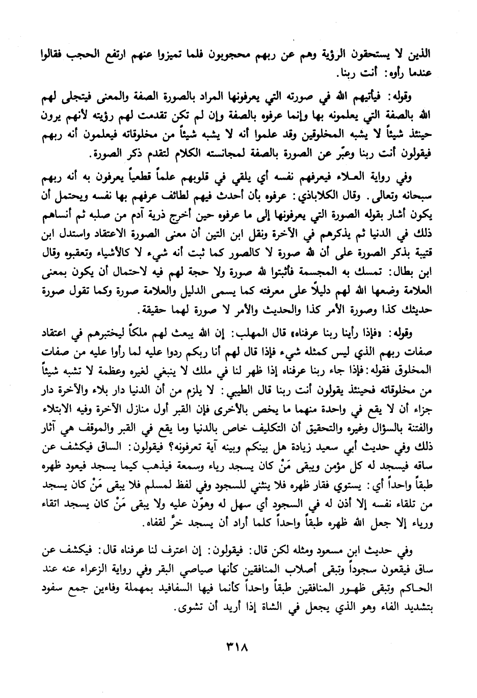 وفي حديث ابن مسعود ومثله لكن قال: فيقولون: إن اعترف لنا عرفناه قال: فيكشف عن ساق فيقعون سجودًا وتبقى أصلاب المنافقين كأنها صياصي البقر وفي رواية الزعراء عنه عند الحاكم وتبقى ظهور المنافقين طبقًا واحدًا كأنما فيها السفافيد بمهملة وفاءين جمع سفود بتشديد الفاء وهو الذي يجعل في الشاة إذا أريد أن تشوى.