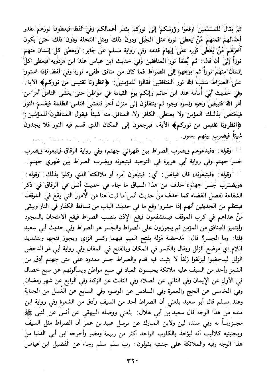 ثم يقال للمسلمين ارفعوا رؤوسكم إلى نوركم بقدر أعمالكم وفي لفظ فيعطون نورهم بقدر أعمالهم فمنهم مَنْ يعطى نوره مثل الجبل ودون ذلك ومثل النخلة ودون ذلك حتى يكون آخرهم مَنْ يعطى نوره على إبهام قدمه وفي رواية مسلم عن جابر: ويعطى كل إنسان منهم نورًا إلى أن قال: ثم يُطفأ نور المنافقين وفي حديث ابن عباس عند ابن مردويه فيعطى كل إنسان منهم نورًا ثم يوجهوا إلى الصراط فما كان من منافق طفىء نوره وفي لفظ فإذا استووا على الصراط سلب الله نور المنافقين فقالوا للمؤمنين: {انْظُرُونَا نَقْتَبِسْ مِنْ نُورِكُمْ} الآية. وفي حديث أبي أُمامة عند ابن حاتم وإنكم يوم القيامة في مواطن حتى يغشى الناس أمر من أمر الله فتبيض وجوه وتسود وجوه ثم ينتقلون إلى منزل آخر فتغشى الناس الظلمة فيقسم النور فيختص بذلك المؤمن ولا يعطى الكافر ولا المنافق منه شيئًا فيقول المنافقون للمؤمنين: {انْظُرُونَا نَقْتَبِسْ مِنْ نُورِكُمْ} الآية، فيرجعون إلى المكان الذي قسم فيه النور فلا يجدون شيئًا فيضرب بينهم بسور.