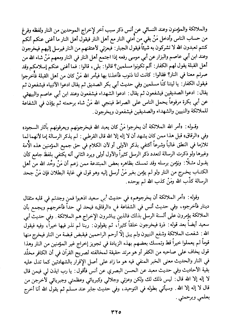 والملائكة والمؤمنون وعند النسائي عن أنس ذكر سبب آخر لإِخراج الموحدين من النار ولفظه وفرغ من حساب الناس وأدخل مَنْ بقي من أُمتي النار مع أهل النار فيقول أهل النار ما أغنى عنكم أنكم كنتم تعبدون الله لا تشركون به شيئًا فيقول الجبار: فبعزتي لأعتقنهم من النار فيرسل إليهم فيخرجون وعند ابن أبي عاصم والبزار عن أبي موسى رفعه إذا اجتمع أهل النار في النار ومعهم مَنْ شاء الله من أهل القبلة يقول لهم الكفار: ألم تكونوا مسلمين؟ قالوا: بلى، قالوا: فما أغنى عنكم إسلامكم وقد صرتم معنا في النار؟ فقالوا: كانت لنا ذنوب فأخذنا بها فيأمر الله مَنْ كان من أهل القبلة فأُخرجوا فيقول الكفار: يا ليتنا كنّا مسلمين وفي حديث أبي بكر الصديق ثم يقال ادعوا الأنبياء فيشفعون ثم يقال: ادعوا الصديقين فيشفعون ثم يقال: ادعوا الشهداء فيشفعون وعند ابن أبي عاصم والبيهقي عن أبي بكرة مرفوعًا يحمل الناس على الصراط فينجي الله مَنْ شاء برحمته ثم يؤذن في الشفاعة للملائكة والنبيين والشهداء والصديقين فيشفعون ويخرجون.