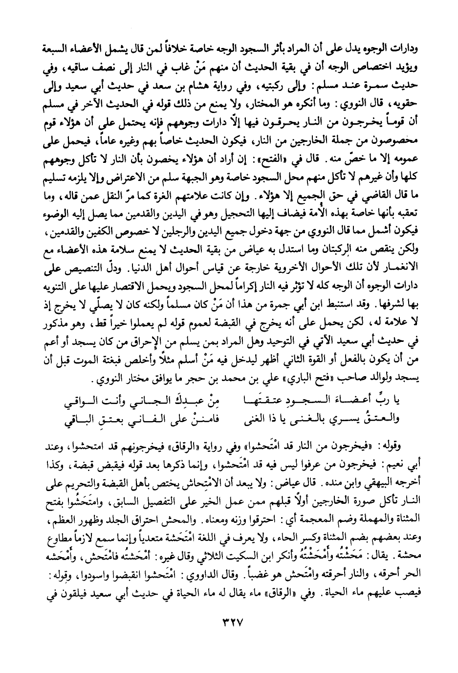 ودارات الوجوه يدل على أن المراد بأثر السجود الوجه خاصة خلافًا لمن قال يشمل الأعضاء السبعة ويؤيد اختصاص الوجه أن في بقية الحديث أن منهم مَنْ غاب في النار إلى نصف ساقيه، وفي حديث سمرة عند مسلم: وإلى ركبتيه، وفي رواية هشام بن سعد في حديث أبي سعيد وإلى حقويه، قال النووي: وما أنكره هو المختار، ولا يمنع من ذلك قوله في الحديث الآخر في مسلم أن قومًا يخرجون من النار يحرقون فيها إلاَّ دارات وجوههم فإنه يحتمل على أن هؤلاء قوم مخصوصون من جملة الخارجين من النار، فيكون الحديث خاصًا بهم وغيره عامًا، فيحمل على عمومه إلا ما خصّ منه. قال في "الفتح": إن أراد أن هؤلاء يخصون بأن النار لا تأكل وجوههم كلها وأن غيرهم لا تأكل منهم محل السجود خاصة وهو الجبهة سلم من الاعتراض وإلا يلزمه تسليم ما قال القاضي في حق الجميع إلا هؤلاء. وإن كانت علامتهم الغرة كما مرّ النقل عمن قاله، وما تعقبه بأنها خاصة بهذه الأُمة فيضاف إليها التحجيل وهو في اليدين والقدمين مما يصل إليه الوضوء فيكون أشمل مما قال النووي من جهة دخول جميع اليدين والرجلين لا خصوص الكفين والقدمين، ولكن ينقص منه الركبتان وما استدل به عياض من بقية الحديث لا يمنع سلامة هذه الأعضاء مع الانغمار لأن تلك الأحوال الأخروية خارجة عن قياس أحوال أهل الدنيا. ودلّ التنصيص على دارات الوجوه أن الوجه كله لا تؤثر فيه النار إكرامًا لمحل السجود ويحمل الاقتصار عليها على التنويه بها لشرفها. وقد استنبط ابن أبي جمرة من هذا أن مَنْ كان مسلمًا ولكنه كان لا يصلّي لا يخرج إذ لا علامة له، لكن يحمل على أنه يخرج في القبضة لعموم قوله لم يعملوا خيرًا قط، وهو مذكور في حديث أبي سعيد الآتي في التوحيد وهل المراد بمن يسلم من الإحراق من كان يسجد أو أعم من أن يكون بالفعل أو القوة الثاني أظهر ليدخل فيه مَنْ أسلم مثلًا وأخلص فبغتة الموت قبل أن يسجد ولوالد صاحب "فتح الباري" علي بن محمد بن حجر ما يوافق مختار النووي.