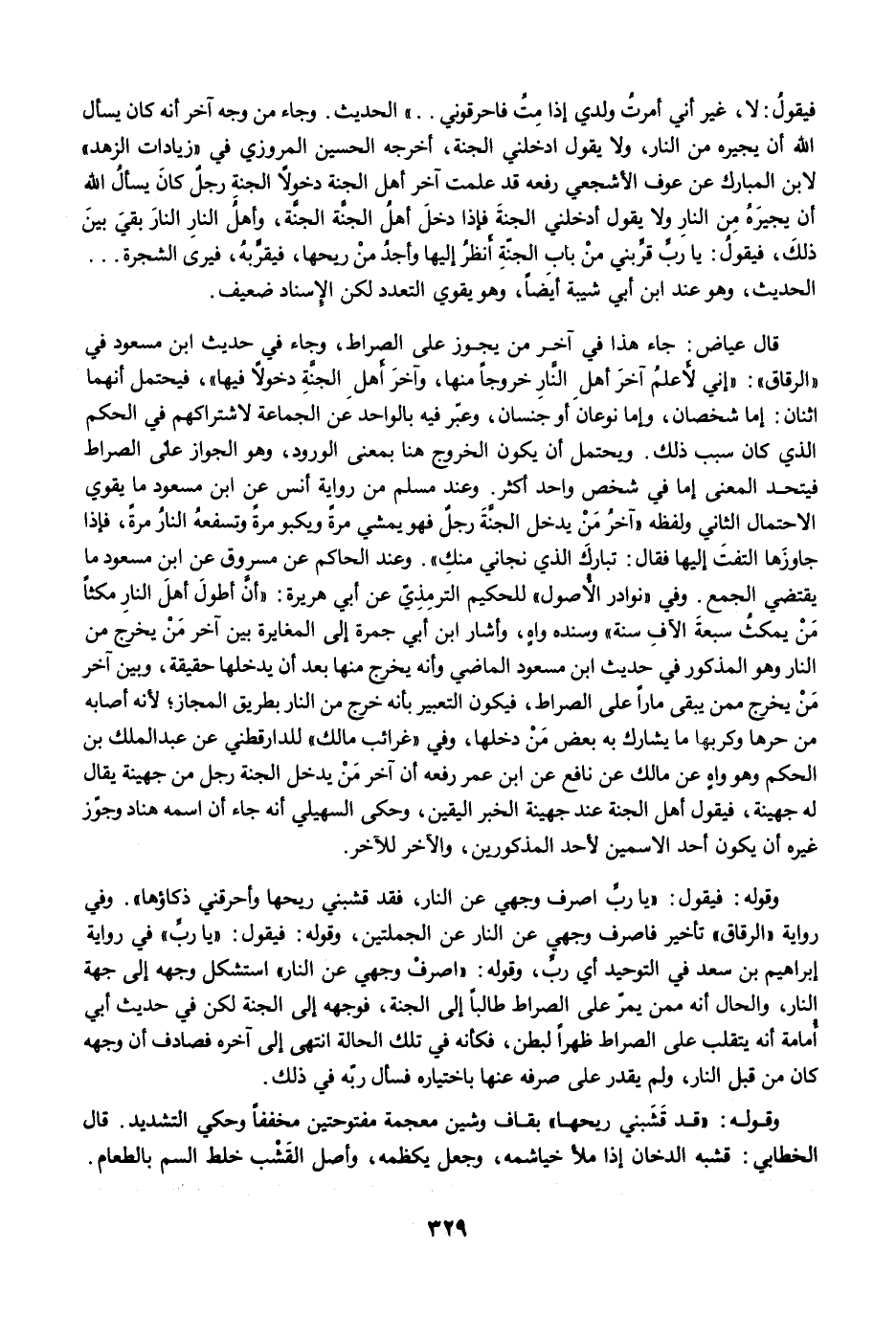 قال عياض: جاء هذا في آخر من يجوز على الصراط، وجاء في حديث ابن مسعود في "الرقاق": "إني لأَعلمُ آخرَ أهل النَّارِ خروجًا منها، وآخرَ أَهل الجنَّةِ دخولًا فيها"، فيحتمل أنهما اثنان: إما شخصان، وإما نوعان أو جنسان، وعبّر فيه بالواحد عن الجماعة لاشتراكهم في الحكم الذي كان سبب ذلك. ويحتمل أن يكون الخروج هنا بمعنى الورود، وهو الجواز على الصراط فيتحد المعنى إما في شخص واحد أكثر. وعند مسلم من رواية أنس عن ابن مسعود ما يقوي الاحتمال الثاني ولفظه "آخرُ مَنْ يدخل الجنَّةَ رجلٌ فهو يمشي مرةً ويكبو مرةً وتسفعهُ النارُ مرةً، فإذا جاوزَها التفتَ إليها فقال: تباركَ الذي نجاني منكِ". وعند الحاكم عن مسروق عن ابن مسعود ما يقتضي الجمع. وفي "نوادر الأُصول" للحكيم الترمِذِيّ عن أبي هريرة: "أنَّ أطولَ أهلَ النارِ مكثًا مَنْ يمكثُ سبعةَ الآفِ سنة" وسنده واهٍ، وأشار ابن أبي جمرة إلى المغايرة بين آخر مَنْ يخرج من النار وهو المذكور في حديث ابن مسعود الماضي وأنه يخرج منها بعد أن يدخلها حقيقة، وبين آخر مَنْ يخرج ممن يبقى مارًا على الصراط، فيكون التعبير بأنه خرج من النار بطريق المجاز؛ لأنه أصابه من حرها وكربها ما يشارك به بعض مَنْ دخلها، وفي "غرائب مالك" للدارقطني عن عبد الملك بن الحكم وهو واهٍ عن مالك عن نافع عن ابن عمر رفعه أن آخر مَنْ يدخل الجنة رجل من جهينة يقال له جهينة، فيقول أهل الجنة عند جهينة الخبر اليقين، وحكى السهيلي أنه جاء أن اسمه هناد وجوّز غيره أن يكون أحد الاسمين لأحد المذكورين، والآخر للآخر.