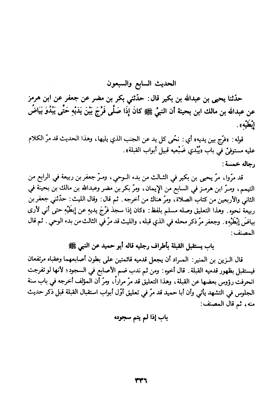 حَدَّثَنَا يَحْيَى بن عبد الله بْنُ بُكَيْرٍ قَالَ: حَدَّثَنِي بَكْرُ بْنُ مُضَرَ عَنْ جَعْفَرٍ عَنِ ابْنِ هُرْمُزَ عَنْ عَبْدِ اللَّهِ بْنِ مَالِكٍ ابْنِ بُحَيْنَةَ أَنَّ النَّبِيَّ -صلى الله عليه وسلم- كَانَ إِذَا صَلَّى فَرَّجَ بَيْنَ يَدَيْهِ حَتَّى يَبْدُوَ بَيَاضُ إِبْطَيْهِ.
