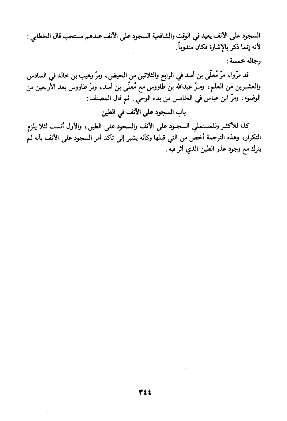 السجود على الأنف يعيد في الوقت والشافعية السجود على الأنف عندهم مستحب قال الخطابي: لأنه إنما ذكر بالإشارة فكان مندوبًا.