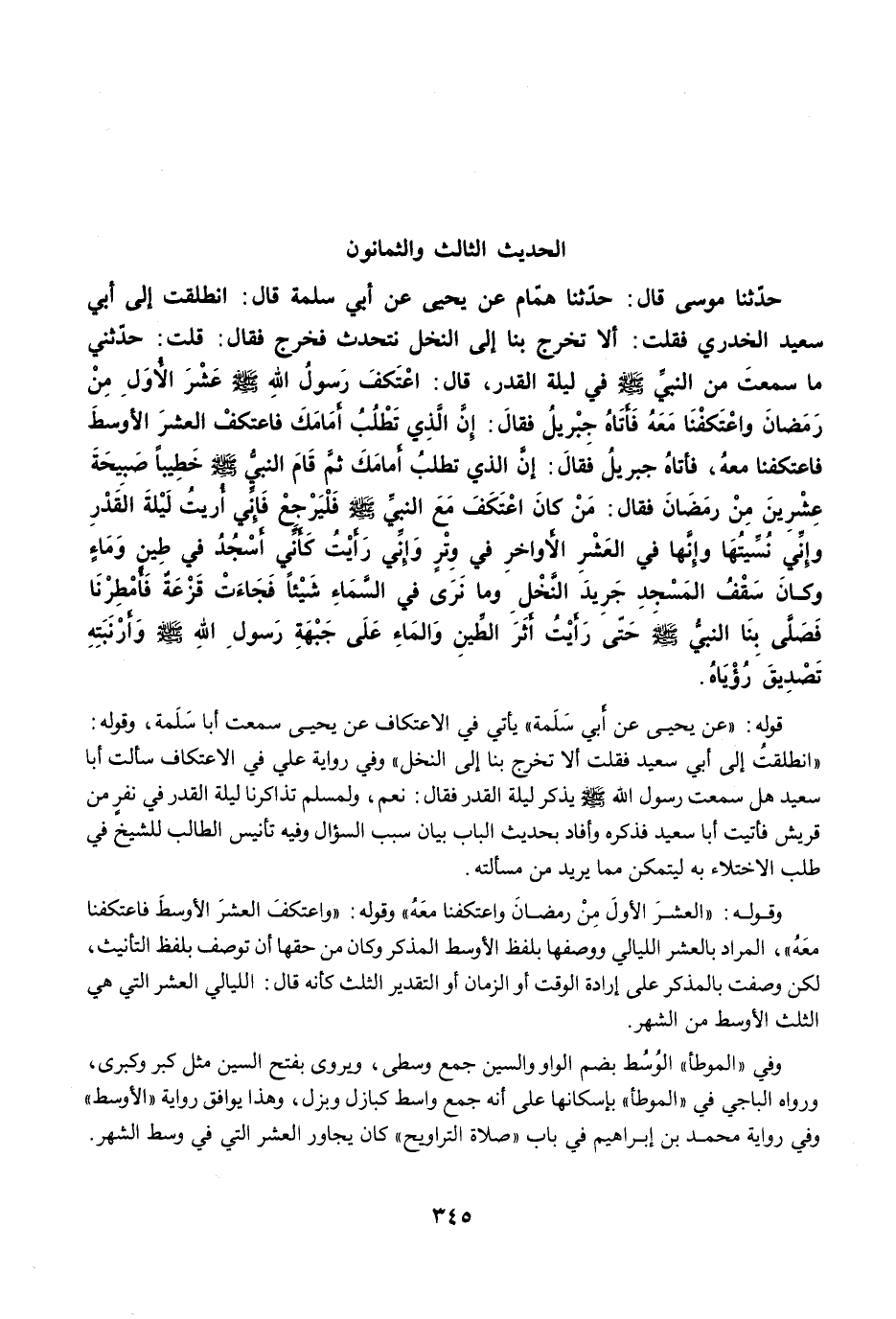 حَدَّثَنَا مُوسَى قَالَ: حَدَّثَنَا هَمَّامٌ عَنْ يَحْيَى عَنْ أَبِي سَلَمَةَ قَالَ: انْطَلَقْتُ إِلَى أَبِي سَعِيدٍ الْخُدْرِيِّ فَقُلْتُ: أَلاَ تَخْرُجُ بِنَا إِلَى النَّخْلِ نَتَحَدَّثْ فَخَرَجَ. فَقَالَ: قُلْتُ: حَدِّثْنِي مَا سَمِعْتَ مِنَ النَّبِيِّ -صلى الله عليه وسلم- فِي لَيْلَةِ الْقَدْرِ. قَالَ اعْتَكَفَ رَسُولُ اللَّهِ -صلى الله عليه وسلم- عَشْرَ الأُوَلِ مِنْ رَمَضَانَ، وَاعْتَكَفْنَا مَعَهُ، فَأَتَاهُ جِبْرِيلُ فَقَالَ: إِنَّ الَّذِي تَطْلُبُ أَمَامَكَ. فَاعْتَكَفَ الْعَشْرَ الأَوْسَطَ، فَاعْتَكَفْنَا مَعَهُ، فَأَتَاهُ جِبْرِيلُ فَقَالَ: إِنَّ الَّذِى تَطْلُبُ أَمَامَكَ. فَقَامَ النَّبِيُّ -صلى الله عليه وسلم- خَطِيبًا صَبِيحَةَ عِشْرِينَ مِنْ رَمَضَانَ فَقَالَ: مَنْ كَانَ اعْتَكَفَ مَعَ النَّبِيِّ -صلى الله عليه وسلم- فَلْيَرْجِعْ، فَإِنِّي أُرِيتُ لَيْلَةَ الْقَدْرِ، وَإِنِّي نُسِّيتُهَا، وَإِنَّهَا فِي الْعَشْرِ الأَوَاخِرِ فِي وِتْرٍ، وَإِنِّى رَأَيْتُ كَأَنِّي أَسْجُدُ فِي طِينٍ وَمَاءٍ. وَكَانَ سَقْفُ الْمَسْجِدِ جَرِيدَ النَّخْلِ وَمَا نَرَى فِي السَّمَاءِ شَيْئًا، فَجَاءَتْ قَزْعَةٌ فَأُمْطِرْنَا، فَصَلَّى بِنَا النَّبِيُّ -صلى الله عليه وسلم- حَتَّى رَأَيْتُ أَثَرَ الطِّينِ وَالْمَاءِ عَلَى جَبْهَةِ رَسُولِ اللَّهِ -صلى الله عليه وسلم- وَأَرْنَبَتِهِ تَصْدِيقَ رُؤْيَاهُ.