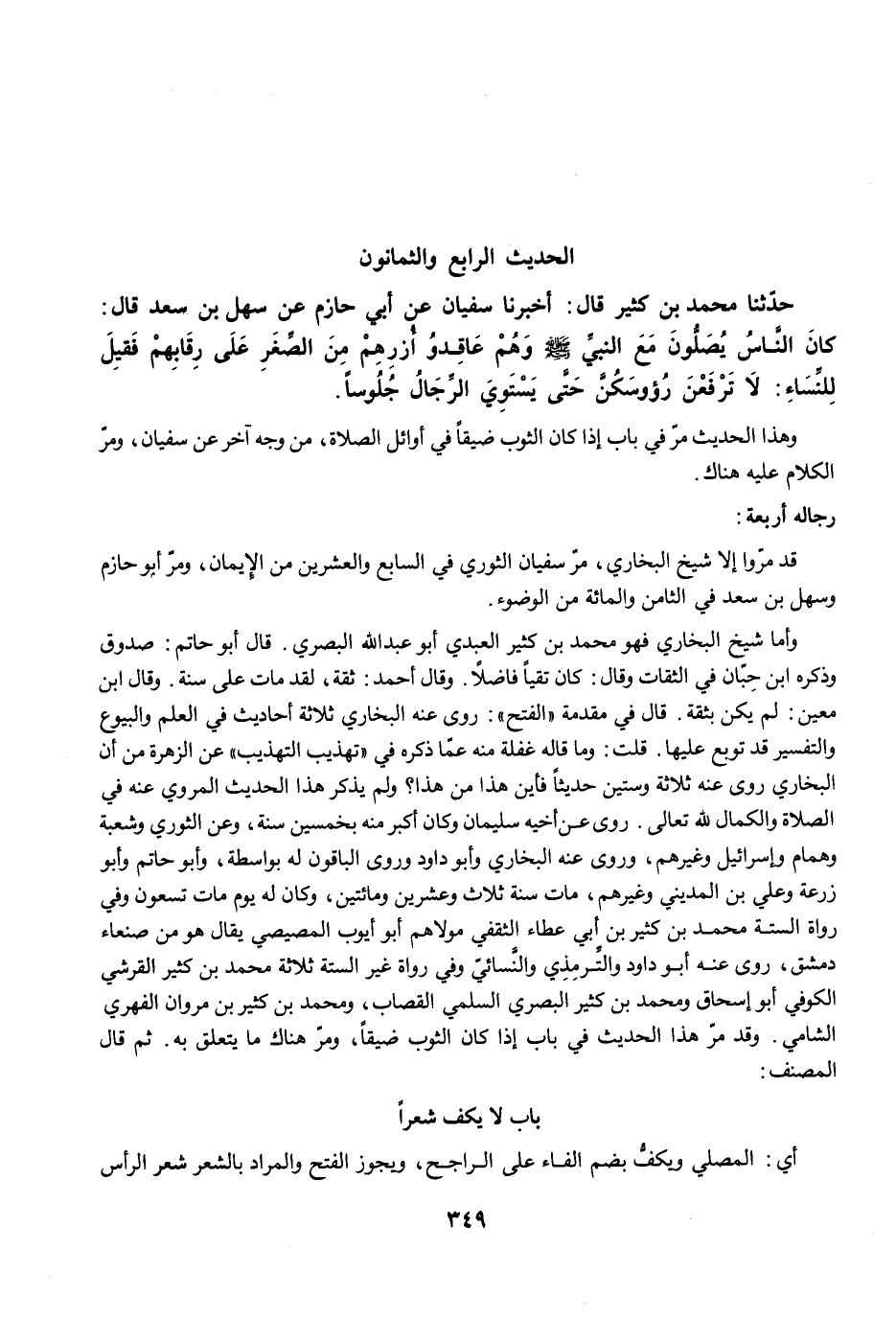 حَدَّثَنَا مُحَمَّدُ بْنُ كَثِيرٍ قَالَ: أَخْبَرَنَا سُفْيَانُ عَنْ أَبِي حَازِمٍ عَنْ سَهْلِ بْنِ سَعْدٍ قَالَ: كَانَ النَّاسُ يُصَلُّونَ مَعَ النَّبِيِّ -صلى الله عليه وسلم- وَهُمْ عَاقِدُو أُزْرِهِمْ مِنَ الصِّغَرِ عَلَى رِقَابِهِمْ فَقِيلَ لِلنِّسَاءِ: لاَ تَرْفَعْنَ رُءُوسَكُنَّ حَتَّى يَسْتَوِيَ الرِّجَالُ جُلُوسًا.