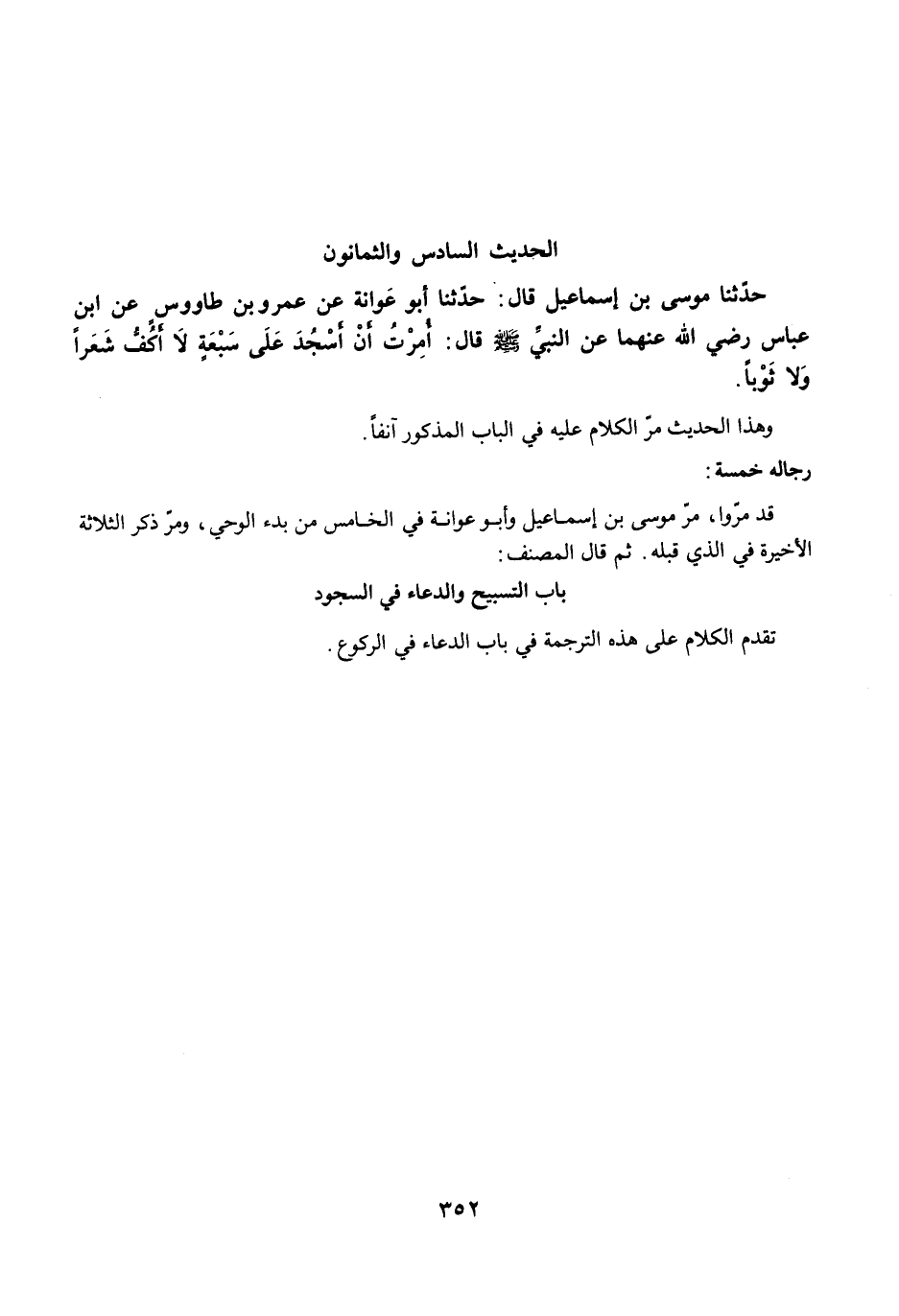 حَدَّثَنَا مُوسَى بْنُ إِسْمَاعِيلَ قَالَ: حَدَّثَنَا أَبُو عَوَانَةَ عَنْ عَمْرٍو عَنْ طَاوُسٍ عَنِ ابْنِ عَبَّاسٍ رضي الله عنهما عَنِ النَّبِيِّ -صلى الله عليه وسلم- قَالَ: أُمِرْتُ أَنْ أَسْجُدَ عَلَى سَبْعَةٍ، لاَ أَكُفُّ شَعَرًا وَلاَ ثَوْبًا.