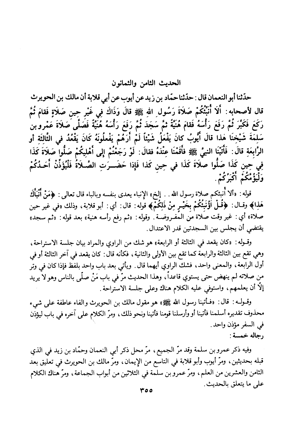 وفيه ذكر عمرو بن سلمة وقد مرّ الجميع، مرّ محل ذكر أبي النعمان وحمّاد بن زيد في الذي قبله بحديثين، ومرّ أيوب وأبو قلابة في التاسع من الإِيمان، ومرّ مالك بن الحويرث في تعليق بعد الثامن والعشرين من العلم، ومرّ عمرو بن سلمة في الثلاثين من أبواب الجماعة، ومرّ هناك الكلام على ما يتعلق بالحديث.