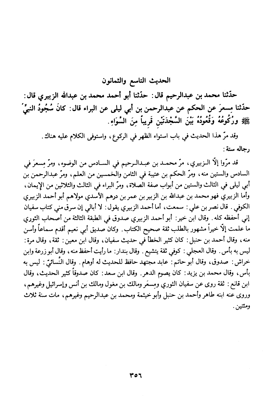 قد مرّوا إلاَّ الزبيري، مرّ محمد بن عبد الرحيم في السادس من الوضوء ومرّ مِسعرَ في السادس والستين منه، ومرّ الحكم بن عتيبة في الثامن والخمسين من العلم، ومرّ عبد الرحمن بن أبي ليلى في الثالث والستين من أبواب صفة الصلاة، ومرّ البراء في الثالث والثلاثين من الإِيمان, وأما الزبيري فهو محمد بن عبد الله بن الزبير بن عمر بن درهم الأسدي مولاهم أبو أحمد الزبيري الكوفي. قال نصر بن علي: سمعت، أما أحمد الزبيري يقول: لا أبالي إن سرق مني كتاب سفيان إني أحفظه كله. وقال ابن خير: أبو أحمد الزبيري صدوق في الطبقة الثالثة من أصحاب الثوري ما علمت إلاَّ خيرًا مشهور بالطلب ثقة صحيح الكتاب. وكان صديق أبي نعيم أقدم سماعًا وأسن منه، وقال أحمد بن حنبل: كان كثير الخطأ في حديث سفيان، وقال ابن معين: ثقة، وقال مرة: ليس به بأس. وقال العجلي: كوفي ثقة يتشيع. وقال بندار: ما رأيت أحفظ منه، وقال أبو زرعة وابن خراش: صدوق، وقال أبو حاتم: عابد مجتهد حافظ للحديث له أوهام. وقال النَّسائيّ: ليس به بأس، وقال محمد بن يزيد: كان يصوم الدهر. وقال ابن سعد: كان صدوقًا كثير الحديث، وقال ابن قانع: ثقة روى عن سفيان الثوري ومِسعَر ومالك بن مغول ومالك بن أنس وإسرائيل وغيرهم، وروى عنه ابنه طاهر وأحمد بن حنبل وأبو خيثمة ومحمد بن عبد الرحيم وغيرهم، مات سنة ثلاث ومئتين.