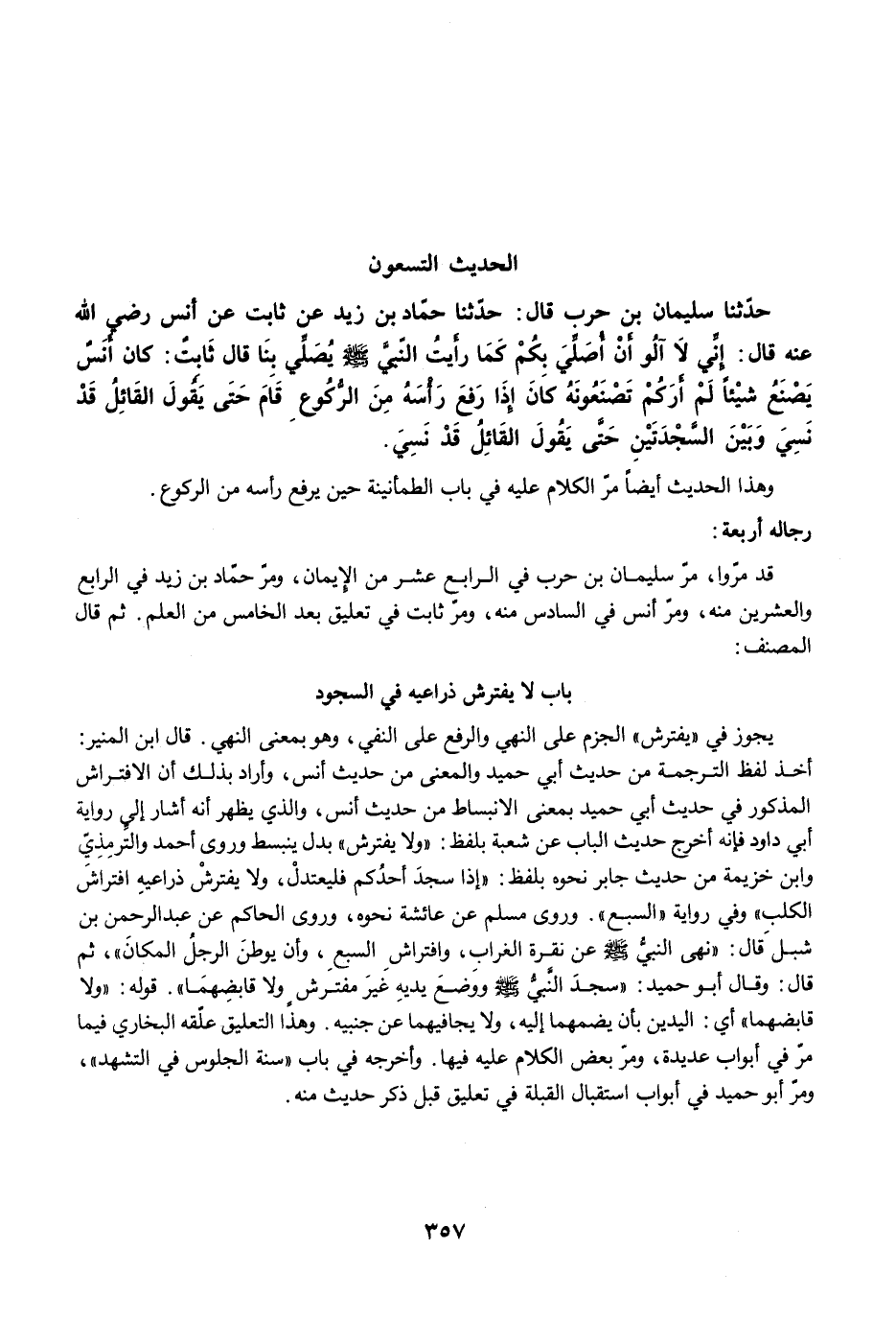 حَدَّثَنَا سُلَيْمَانُ بْنُ حَرْبٍ قَالَ: حَدَّثَنَا حَمَّادُ بْنُ زَيْدٍ عَنْ ثَابِتٍ عَنْ أَنَسٍ رضي الله عنه قَالَ: إِنِّي لاَ آلُو أَنْ أُصَلِّيَ بِكُمْ كَمَا رَأَيْتُ النَّبِيَّ -صلى الله عليه وسلم- يُصَلِّي بِنَا. قَالَ ثَابِتٌ: كَانَ أَنَسٌ يَصْنَعُ شَيْئًا لَمْ أَرَكُمْ تَصْنَعُونَهُ، كَانَ إِذَا رَفَعَ رَأْسَهُ مِنَ الرُّكُوعِ قَامَ حَتَّى يَقُولَ الْقَائِلُ قَدْ نَسِيَ. وَبَيْنَ السَّجْدَتَيْنِ حَتَّى يَقُولَ الْقَائِلُ قَدْ نَسِيَ.
