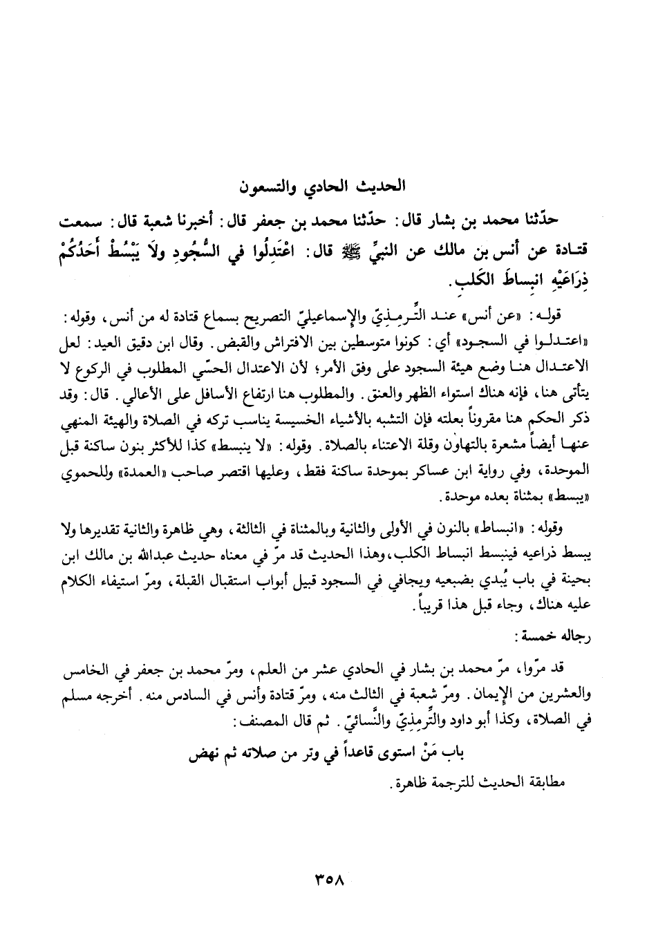 حَدَّثَنَا مُحَمَّدُ بْنُ بَشَّارٍ قَالَ: حَدَّثَنَا مُحَمَّدُ بْنُ جَعْفَرٍ قَالَ: حَدَّثَنَا شُعْبَةُ قَالَ: سَمِعْتُ قَتَادَةَ عَنْ أَنَسِ بْنِ مَالِكٍ عَنِ النَّبِيِّ -صلى الله عليه وسلم- قَالَ: اعْتَدِلُوا فِي السُّجُودِ، وَلاَ يَبْسُطْ أَحَدُكُمْ ذِرَاعَيْهِ انْبِسَاطَ الْكَلْبِ.