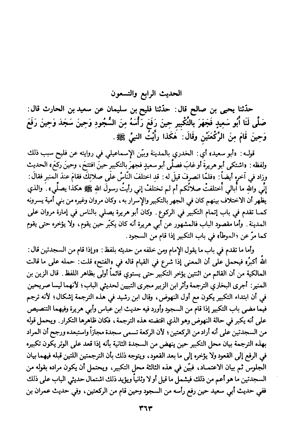 حَدَّثَنَا يَحْيَى بْنُ صَالِحٍ قَالَ: حَدَّثَنَا فُلَيْحُ بْنُ سُلَيْمَانَ عَنْ سَعِيدِ بْنِ الْحَارِثِ قَالَ: صَلَّى لَنَا أَبُو سَعِيدٍ فَجَهَرَ بِالتَّكْبِيرِ حِينَ رَفَعَ رَأْسَهُ مِنَ السُّجُودِ، وَحِينَ سَجَدَ، وَحِينَ رَفَعَ، وَحِينَ قَامَ مِنَ الرَّكْعَتَيْنِ وَقَالَ: هَكَذَا رَأَيْتُ النَّبِيَّ -صلى الله عليه وسلم-.