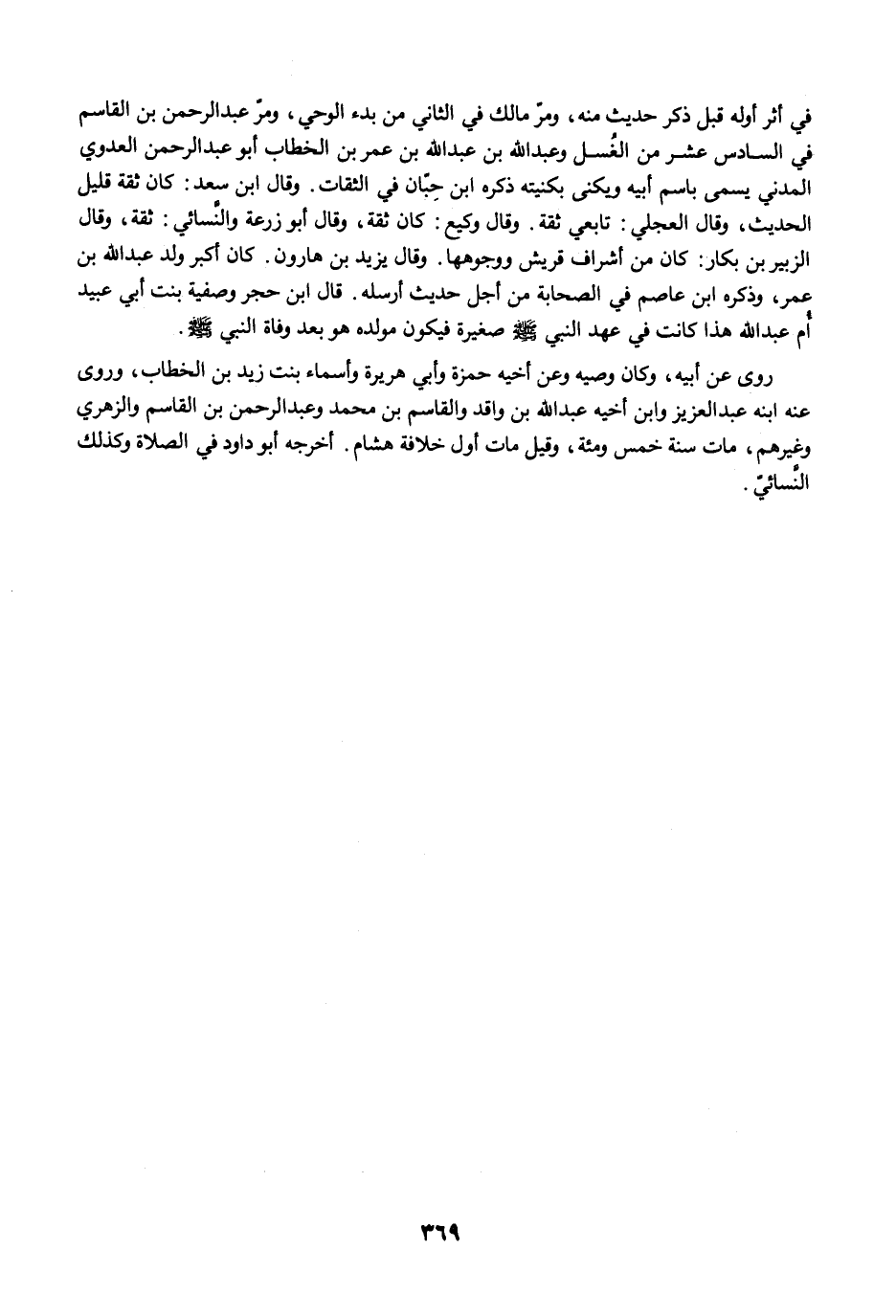 روى عن أبيه، وكان وصيه وعن أخيه حمزة وأبي هريرة وأسماء بنت زيد بن الخطاب، وروى عنه ابنه عبد العزيز وابن أخيه عبد الله بن واقد والقاسم بن محمد وعبد الرحمن بن القاسم والزهري وغيرهم، مات سنة خمس ومئة، وقيل مات أول خلافة هشام. أخرجه أبو داود في الصلاة وكذلك النَّسائيّ.