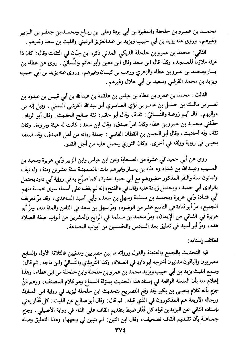 روى عن أبي حميد في عشرة من الصحابة وعن ابن عباس وابن الزبير وأبي هريرة وسعيد بن المسيب وعبد الله بن شداد وعطاء بن يسار وغيرهم مات بالمدينة سنة عشرين ومئة، وله نيف وثمانون سنة والنفر المذكور حضورهم مع أبي حميد عشرة، كما صرّح به في رواية أبي داود يحتمل بالراوي أبي حميد، ويحتمل زيادة عليه وقال في "الفتح" إنه لم يقف على أسماء سوى خمسة منهم أبي قتادة وأبي هريرة ومحمد بن مسلمة وسهل بن سعد، وأبي أسيد الساعدي، وقد مرّ تعريف الجميع، مرّ أبو قتادة في التاسع عشر من الوضوء ومرّ سهل بن سعد في الثامن والمئة منه، ومرّ أبو هريرة في الثاني من الإِيمان, ومرّ محمد بن مسلمة في الرابع والعشرين من أبواب صفة الصلاة هذه، ومرّ أبو أسيد في تعليق بعد السادس والخمسين من أبواب الجماعة.