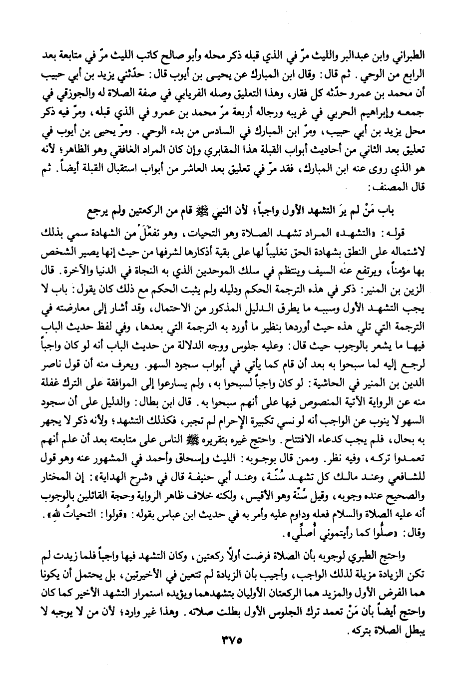 قوله: "التشهد" المراد تشهد الصلاة وهو التحيات، وهو تفعّل من الشهادة سمي بذلك لاشتماله على النطق بشهادة الحق تغليبًا لها على بقية أذكارها لشرفها من حيث إنه يصير الشخص بها مؤمنًا، ويرتفع عنه السيف وينتظم في سلك الموحدين الذي به النجاة في الدنيا والآخرة. قال الزين بن المنير: ذكر في هذه الترجمة الحكم ودليله ولم يثبت الحكم مع ذلك كان يقول: باب لا يجب التشهد الأول وسببه ما يطرق الدليل المذكور من الاحتمال، وقد أشار إلى معارضته في الترجمة التي تلي هذه حيث أوردها بنظير ما أورد به الترجمة التي بعدها، وفي لفظ حديث الباب فيها ما يشعر بالوجوب حيث قال: وعليه جلوس ووجه الدلالة من حديث الباب أنه لو كان واجبًا لرجع إليه لما سبحوا به بعد أن قام كما يأتي في أبواب سجود السهو. ويعرف منه أن قول ناصر الدين بن المنير في الحاشية: لو كان واجبًا لسبحوا به، ولم يسارعوا إلى الموافقة على الترك غفلة منه عن الرواية الآتية المنصوص فيها على أنهم سبحوا به. قال ابن بطال: والدليل على أن سجود السهو لا ينوب عن الواجب أنه لو نسي تكبيرة الإحرام لم تجبر، فكذلك التشهد؛ ولأنه ذكر لا يجهر به بحال، فلم يجب كدعاء الافتتاح. واحتج غيره بتقريره -صلى الله عليه وسلم- الناس على متابعته بعد أن علم أنهم تعمدوا تركه، وفيه نظر. وممن قال بوجوبه: الليث وإسحاق وأحمد في المشهور عنه وهو قول للشافعي وعند مالك كل تشهد سُنّة، وعند أبي حنيفة قال في "شرح الهداية": ان المختار والصحيح عنده وجوبه، وقيل سُنّة وهو الأقيس، ولكنه خلاف ظاهر الرواية وحجة القائلين بالوجوب أنه عليه الصلاة والسلام فعله وداوم عليه وأمر به في حديث ابن عباس بقوله: "قولوا: التحياتُ للهِ". وقال: "صلُّوا كما رأيتموني أُصلِّي".